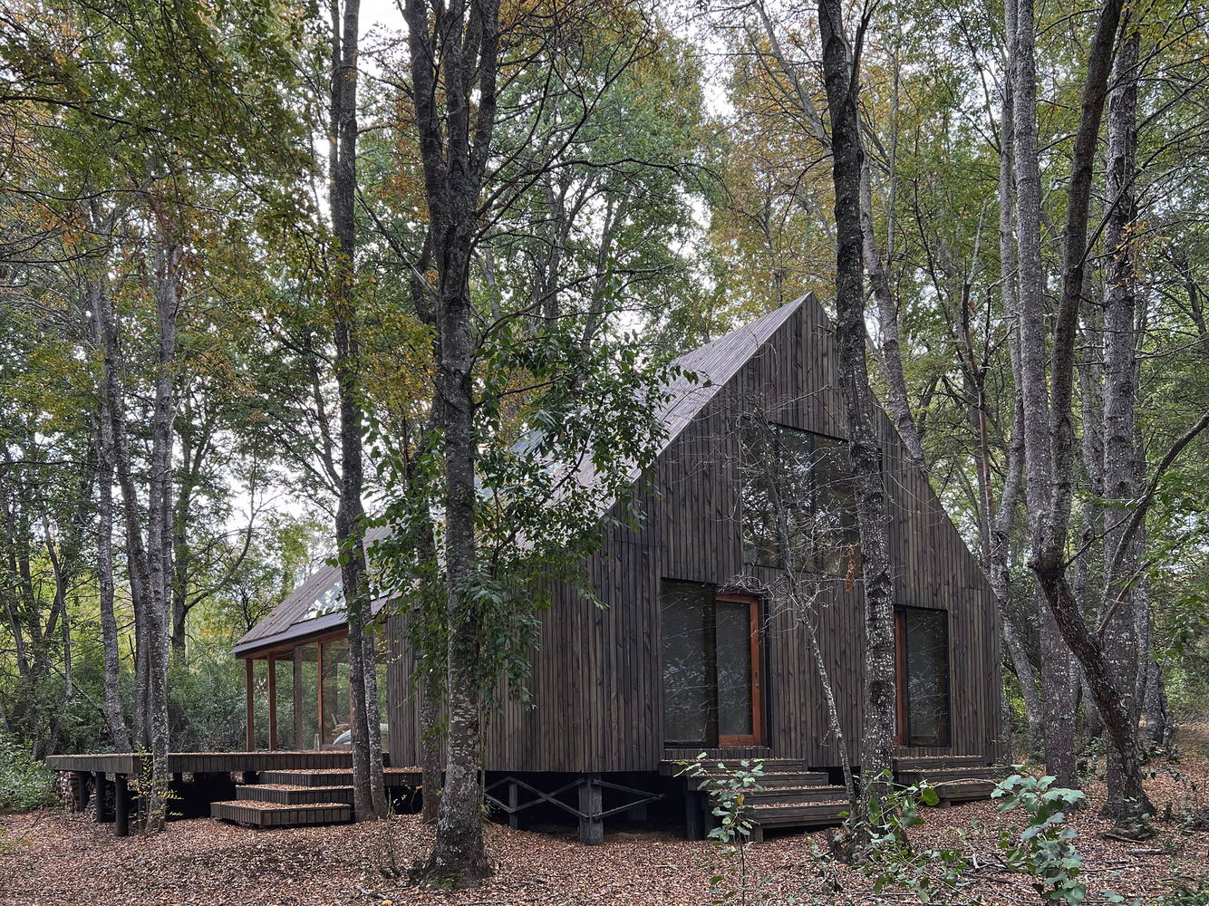 The house's location in a deciduous forest provides an ingenious climate solution. During summer, the foliage shades the interior, keeping it cool. In winter, as leaves fall, sunlight warms the house, reducing energy use and enhancing comfort.