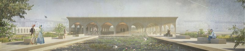 The building has two entrances and many windows with the view of the painting landscapes full of fauna and flora.The pavilion is surrounded by the plaza with benches and recreation spaces. Before the building there is a big pond with the recreated water ecosystem. It can also be a space for the birds and smaller animals, that people can watch and learn about from the information cards placed around. Back, there is the main plaza with the retention channels that can be used by visitors to cool down on hot days. Near by, there are wooden platforms with boats.