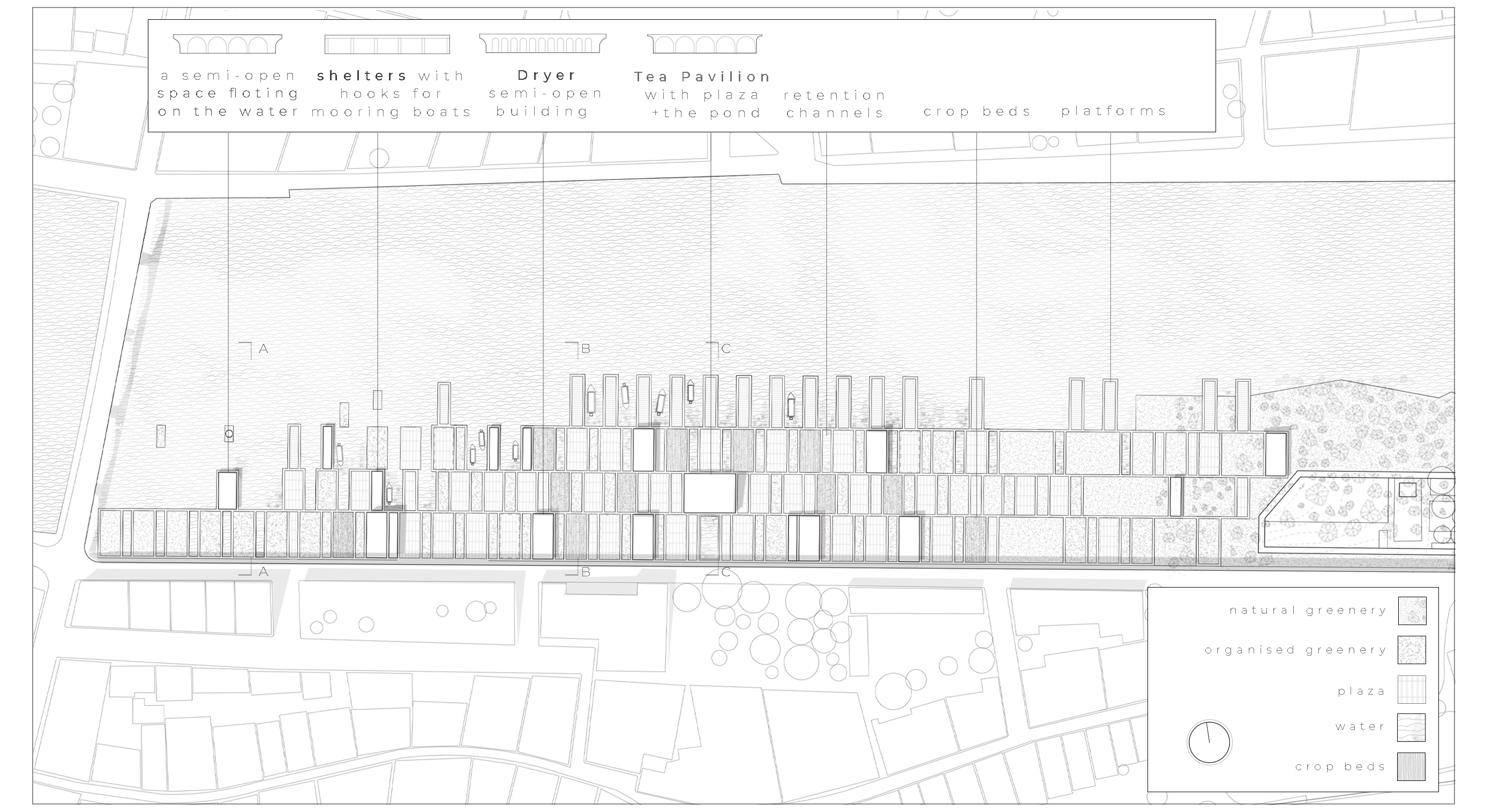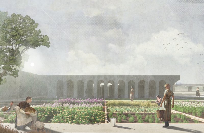 The difficulties of the area are the constant flooding and high temperature which results in a devastated land and hard cultivation of plants. By creating retential channels the water may flood the ground less frequently. Terzo Giardino is naturally green. The concept was to help the nature and  rebuild the lack of river's ecosystem. Channels have the vegetation resulting from the analysis of the Arno River bottom f.ex.: Zannichellia palustris, Persicaria amphibia, Bidens tripartita, Sparganietum erecti, Bolboschoenus maritimus, Callitriche and more.The land is full of the field plants that grow on the natural green side and on the crops beds. They also can be irrigated by conecting them to created retential channels. To make the place more characteristic the idea was, to use the vegetation as the main idea of the project and use it as a products to sell.Many of them have healing properties or are perfect for drinking, rubbing or aromatherapy. The new function and eco-thinking style of the place can be a good landmark for the city Florence and its future apperance.