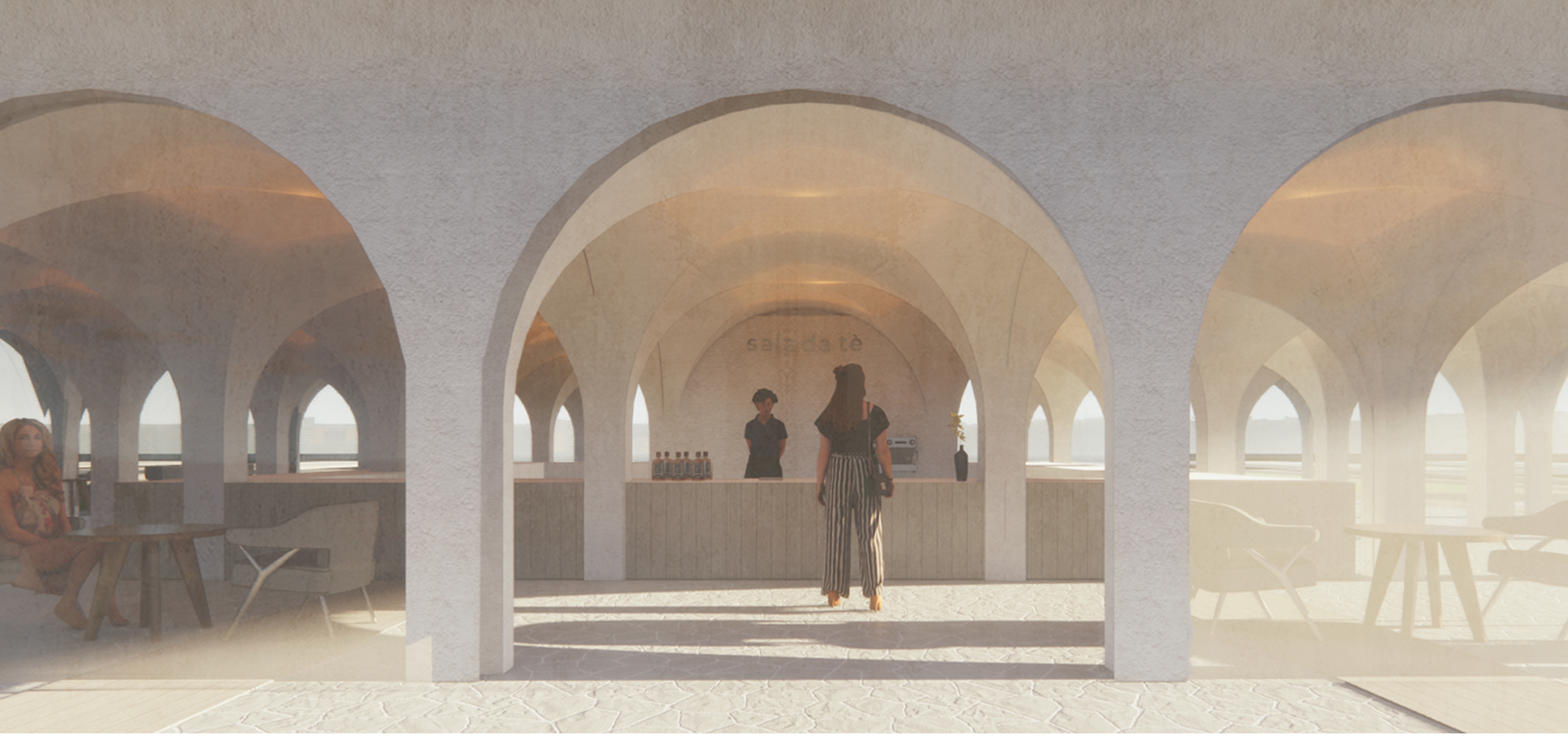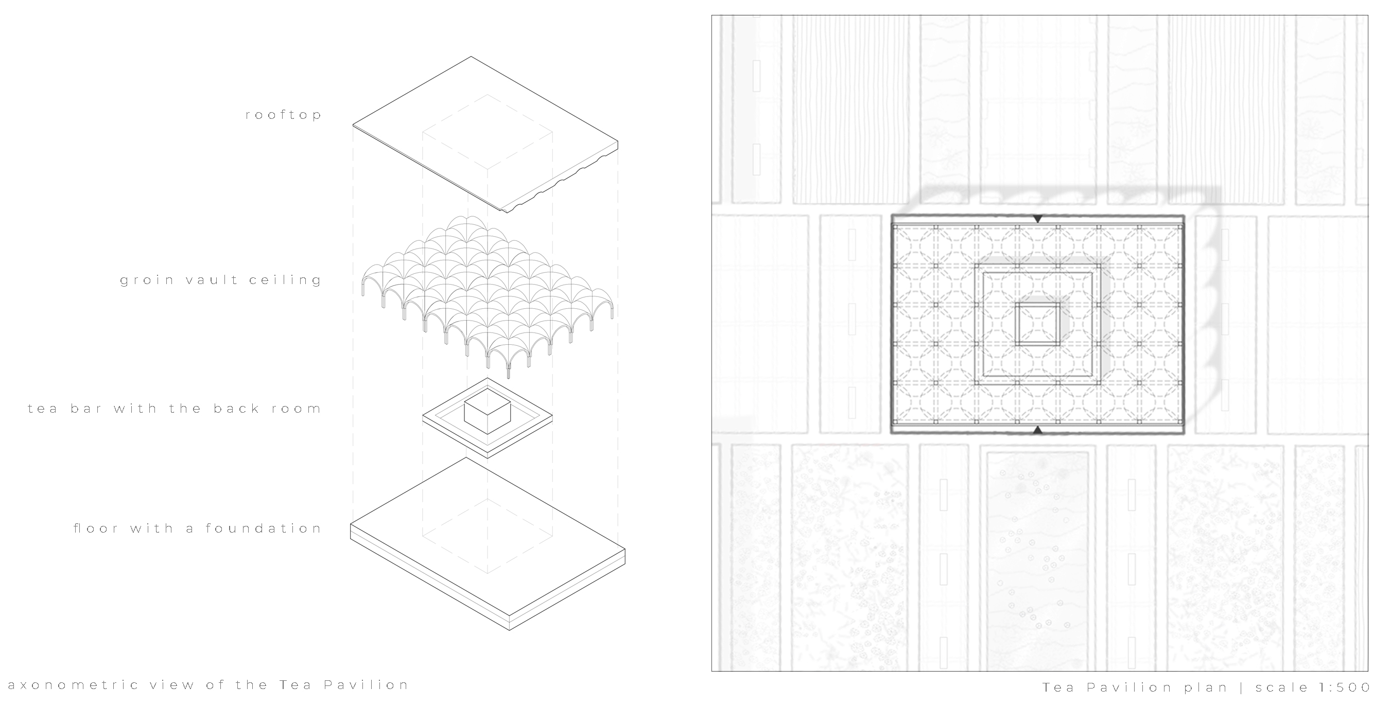 The Tea Pavilion is a stone building on the horizontal plan. It has the groin vaulted ceiling, inspired by Florence Renaissance. The plan is symmetrical and minimalistic. The conception includes the bar and the backroom in the middle of the building. The dryed flowers and herbs are brought to the Tea Pavilion from the Dryer buildings and then the napars are created directly on this spot. It can be also a selling space of tea, napars, syrops, essential oils and more.