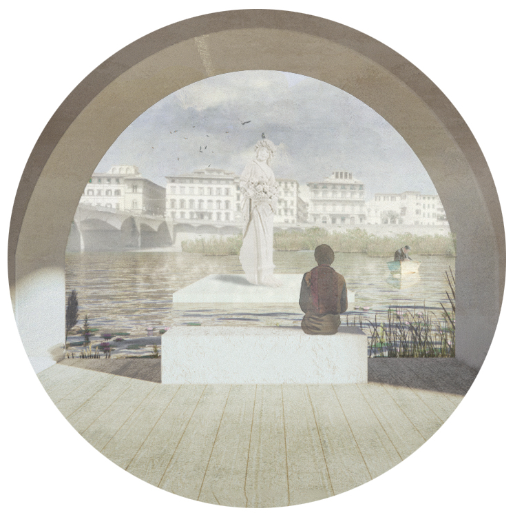 In the concept the chosen artpiece is the Spring in the guise of Flora (1616-17) by a sculptor Pietro Bernini, Giovanni Lorenzo Bernini’s father. The sculpture becomes a symbol of a place, that shows the relationship between human and flora. There is also a view for the Ponte alle Grazie and the boats that pass under it. It all ends here...