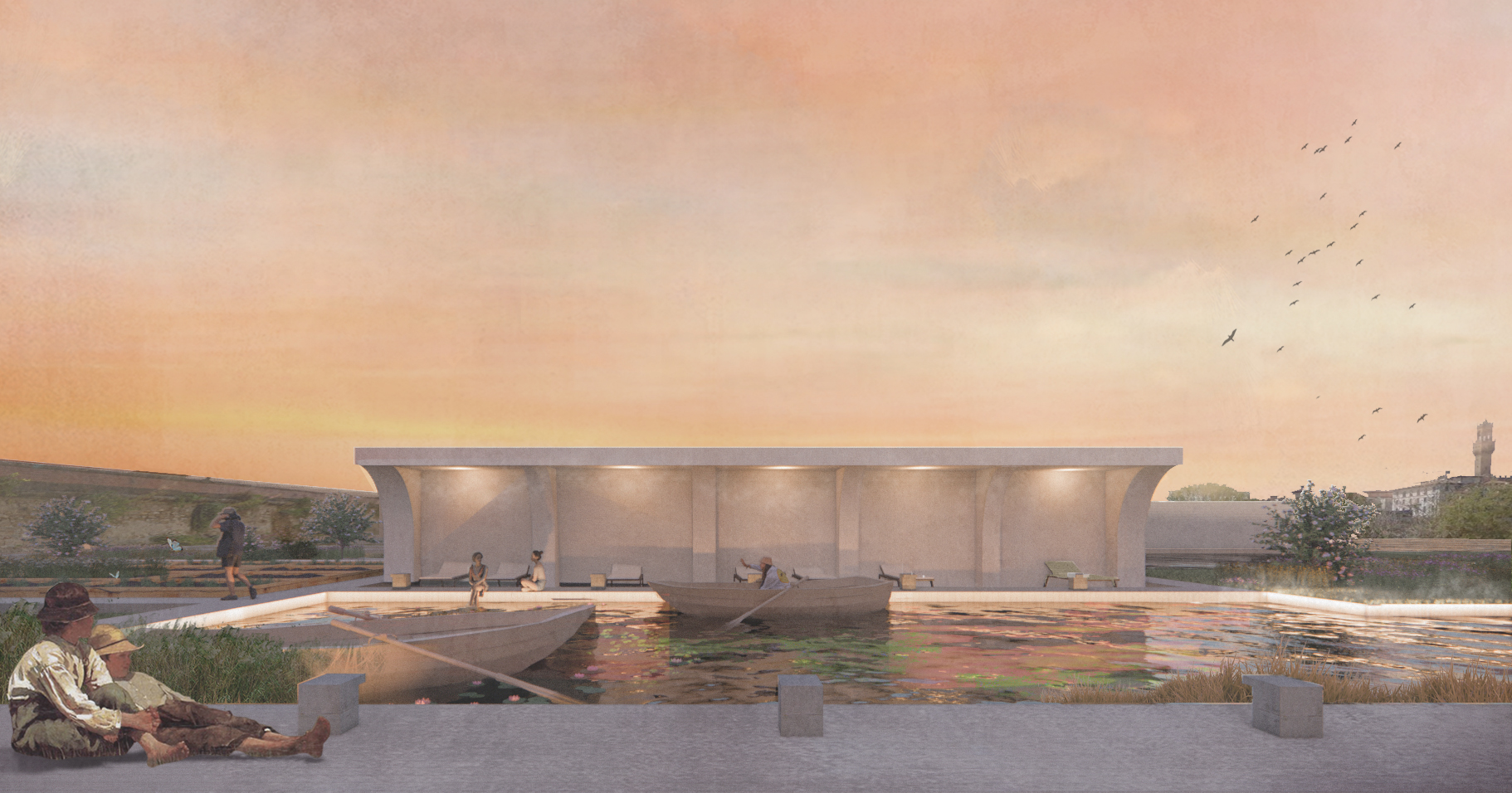 Florence looking from the top has a tight urban development, light elevations and rooftops in ocher color. The river Arno is like a border that shows, that on the other side of the city is more green, closer to nature. The concept was to create a green landmark for the city.