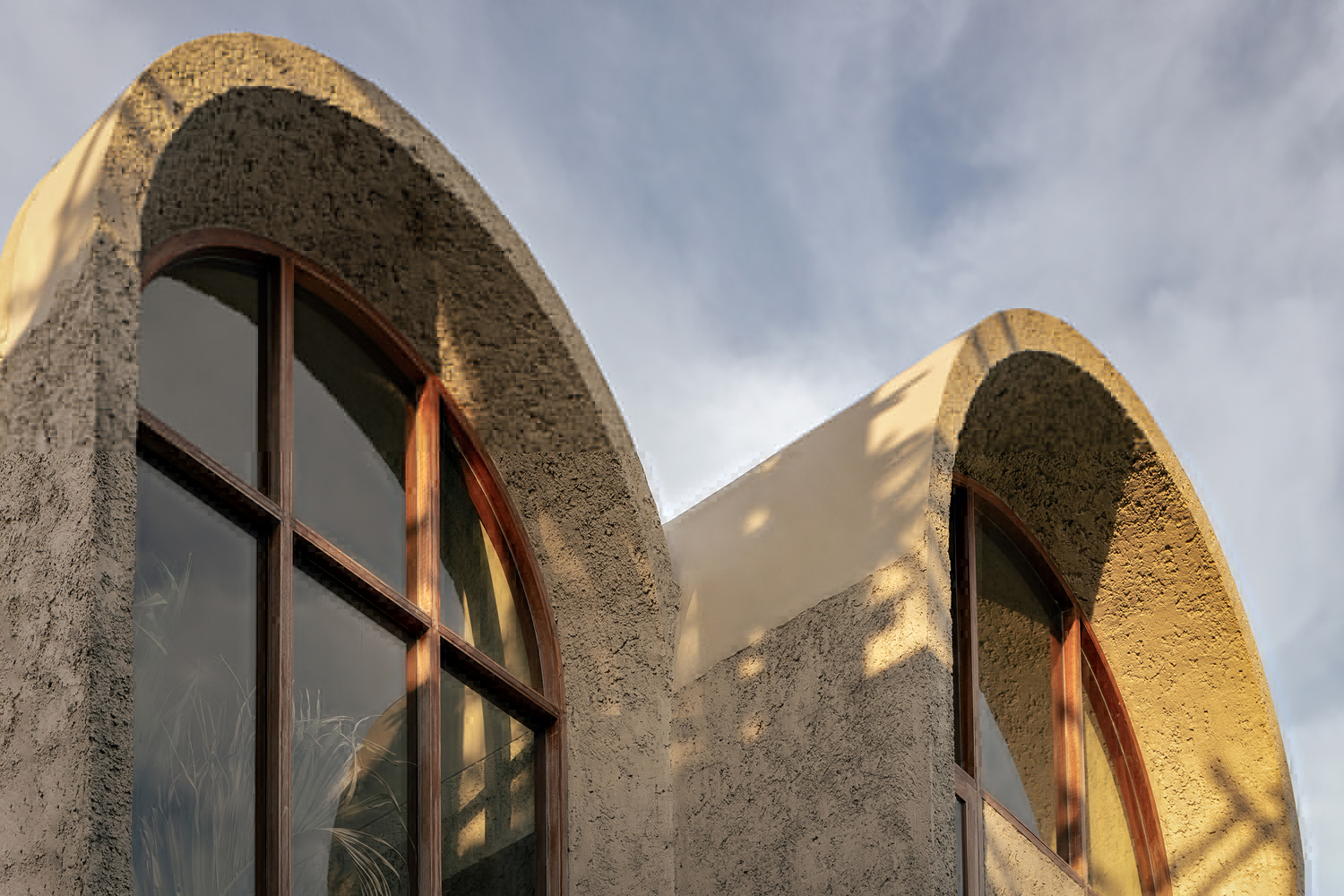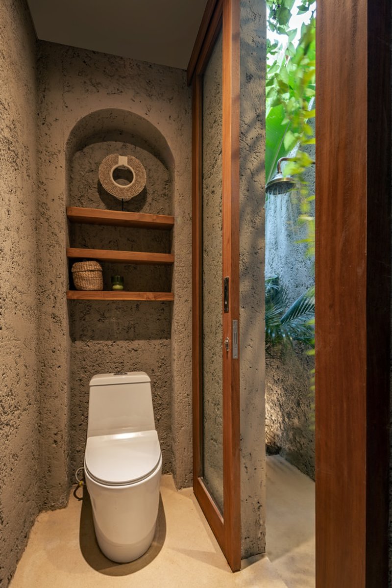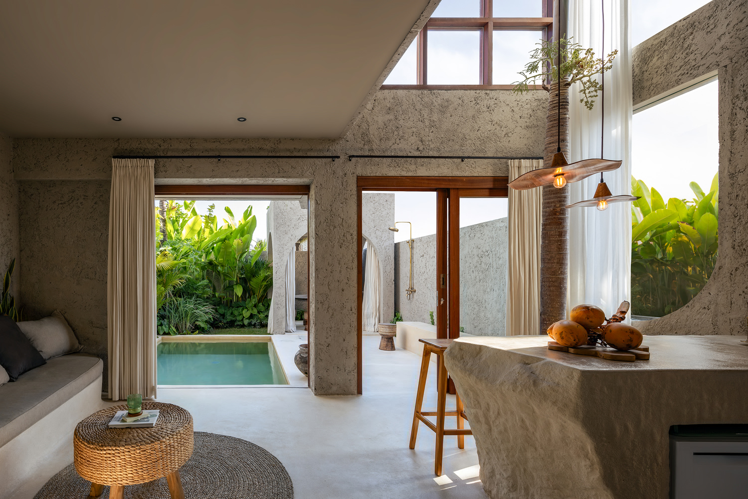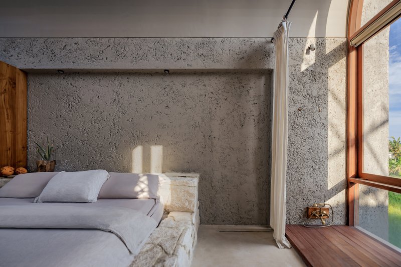 The architectural language of Gua Gua Villa draws inspiration from Mediterranean architecture, reinterpreted through a tropical Balinese context. This influence is expressed through arched geometries, curved openings, and soft roof forms that appear across windows, doors, and interior transitions. Rough-textured walls finished with natural plaster contrast with smooth white-painted ceilings, emphasizing the purity and precision of the arch forms.