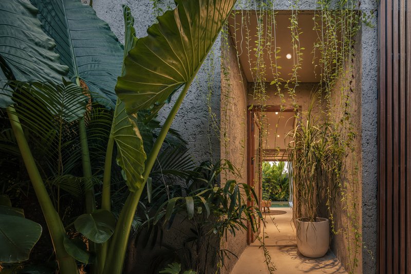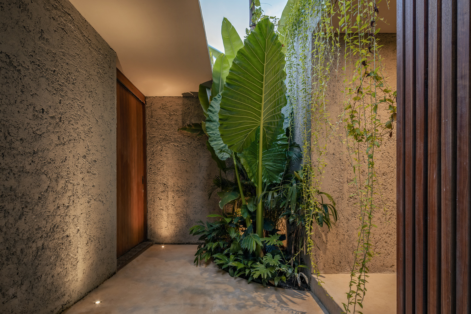 The two-bedroom villas occupy particularly narrow sites, prompting a more playful approach to floor levels and spatial sequencing. Storage and MEP spaces are positioned at the front for easy access, while the main living areas unfold gradually toward the rear. An open kitchen with an island connects seamlessly to the living room, with clusters of indoor plants forming a lush interior garden that softens transitions between functions.