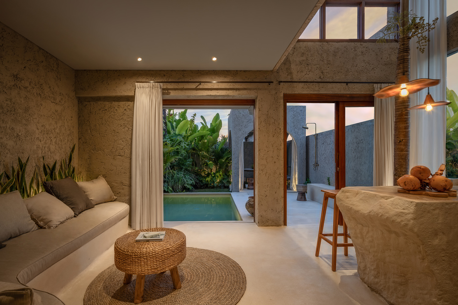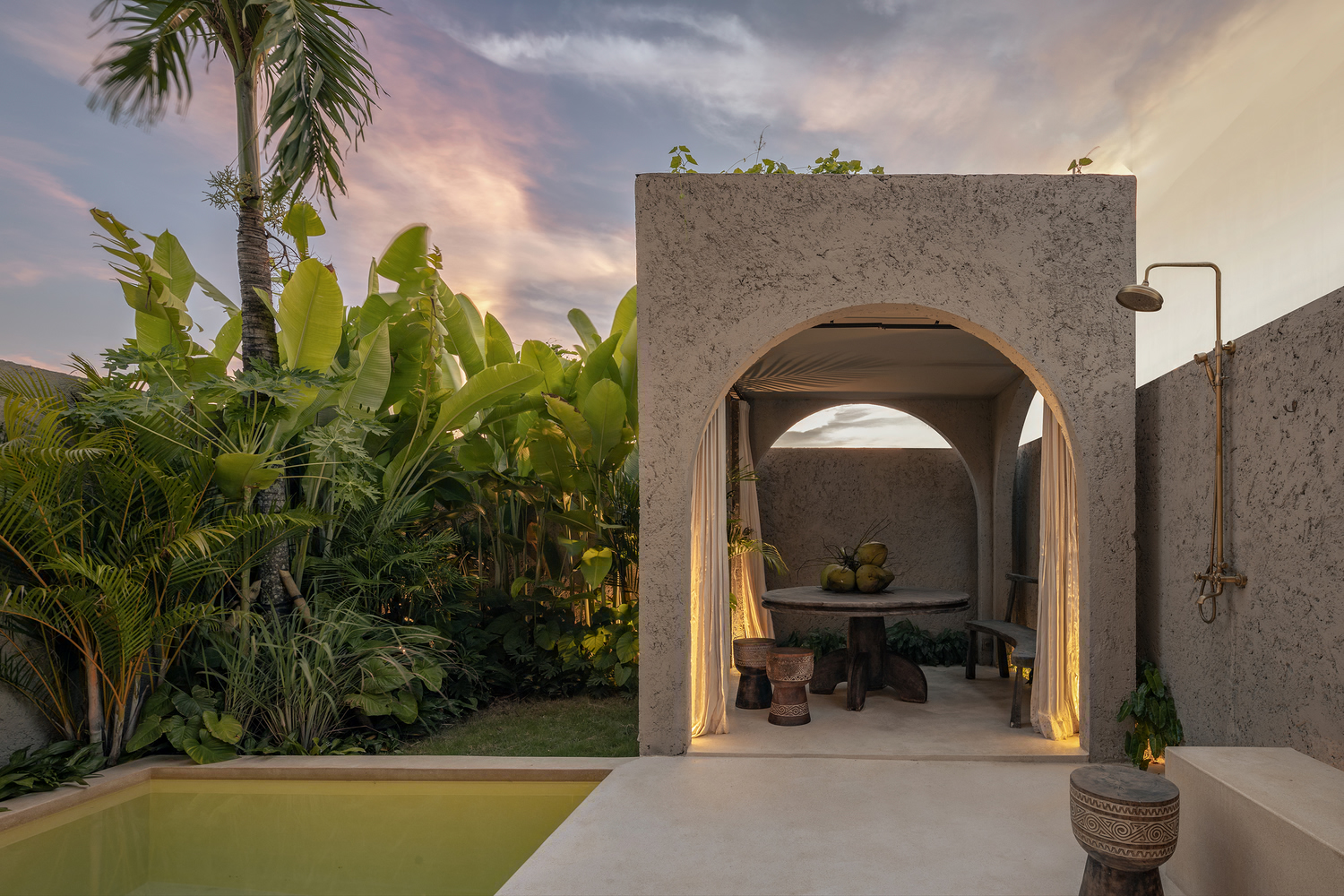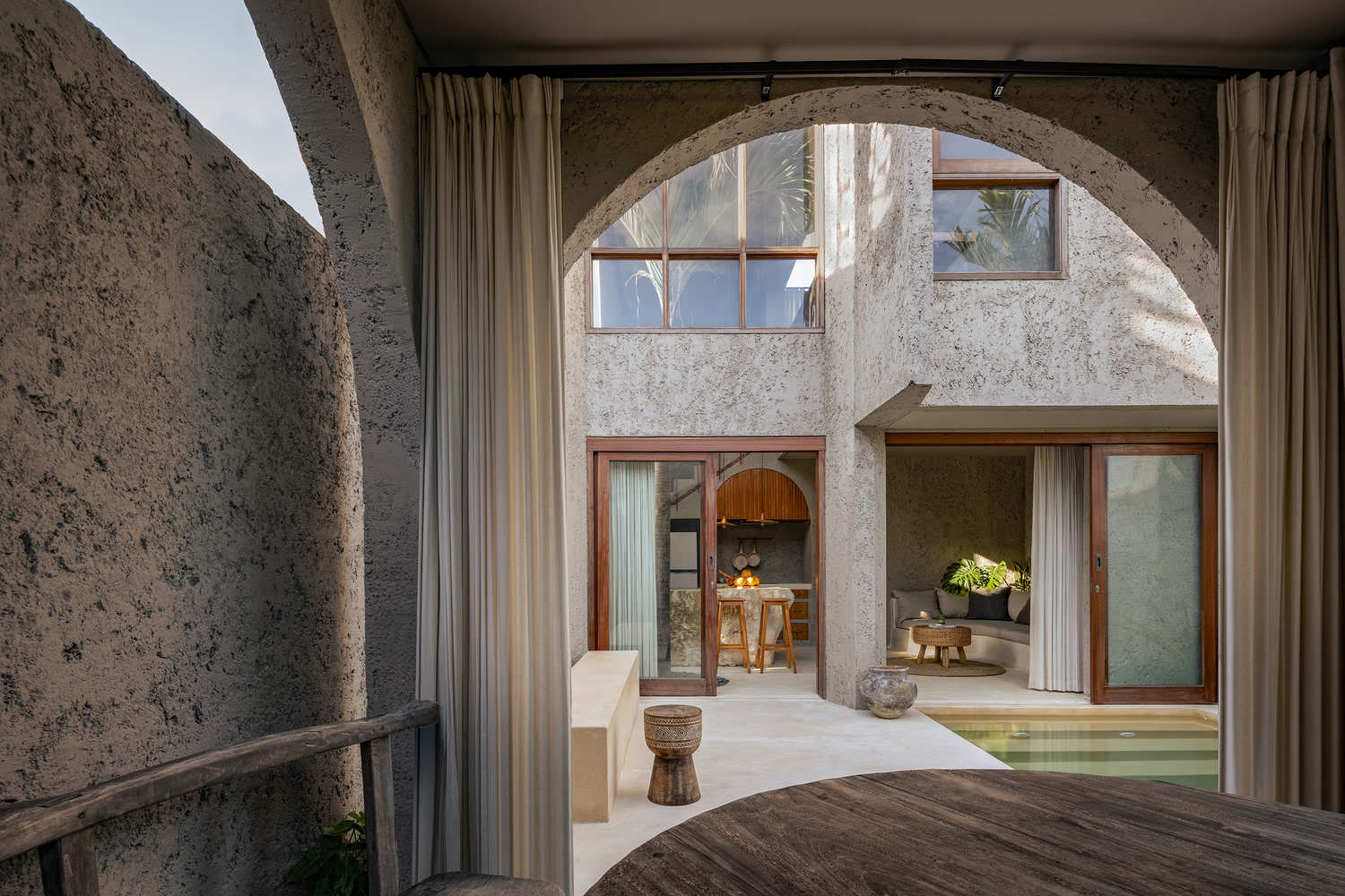 Mediterranean-inspired Bali villas with arched forms, cave-like plastered interiors, dynamic circulation, indoor gardens, and immersive indoor-outdoor tropical living experiences.
