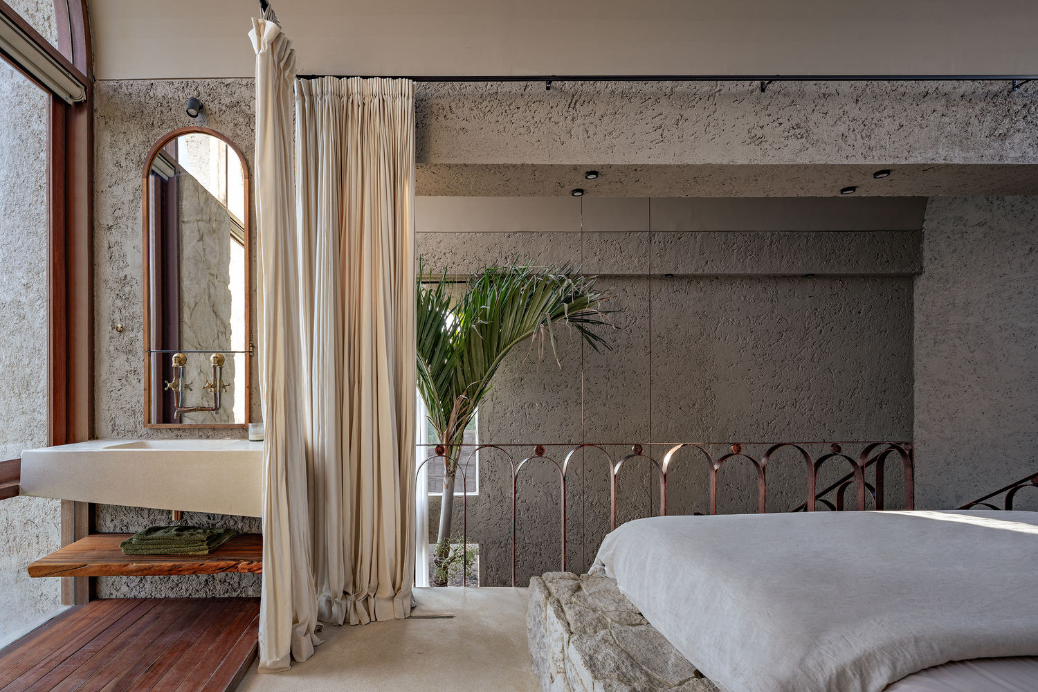 Upstairs, the bedroom features openings on two sides to maximize ventilation and daylight. The shower area is partially enclosed by a continuous curtain that wraps three sides of the space, functioning as a soft, flexible wall. Window placement balances functionality, privacy, and façade composition, ensuring cohesive interior and exterior expressions.