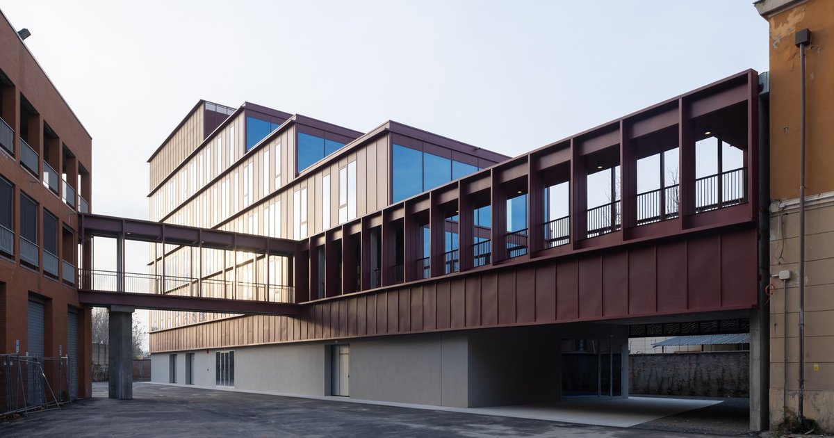 Architecturally, the project is defined by compositional rigor and subtle variation. The façades are structured through a precise system of horizontal string courses and modular panels, generating shallow reliefs that animate the elevations without excess. Chromatically, the envelope references Bologna’s characteristic red tones, grounding the contemporary intervention within the city’s material memory while maintaining a distinctly modern expression. This restrained yet expressive façade strategy reinforces themes of order, rhythm, and controlled transformation.