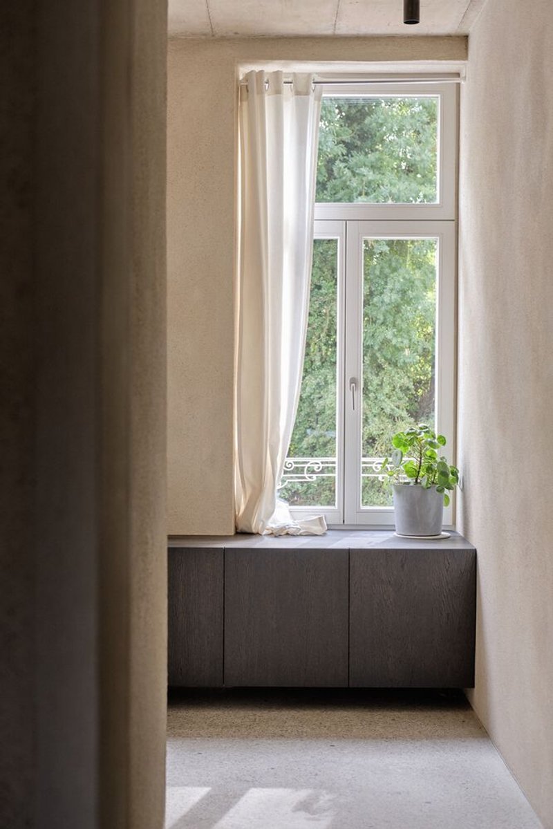 The building underwent a complete transformation, restoring its original sandstone walls and enhancing its functionality. Spanning four levels, the townhouse features minimalist interiors characterized by natural materials like lime plaster and dark brown wood. These design choices create a timeless aesthetic that complements the building’s history.