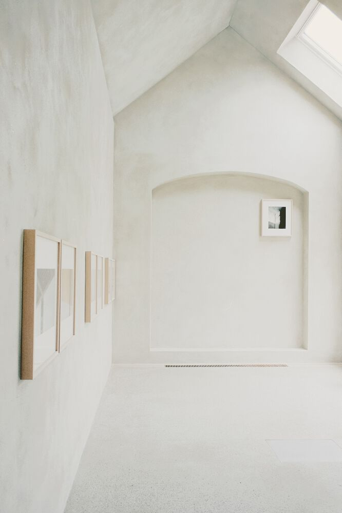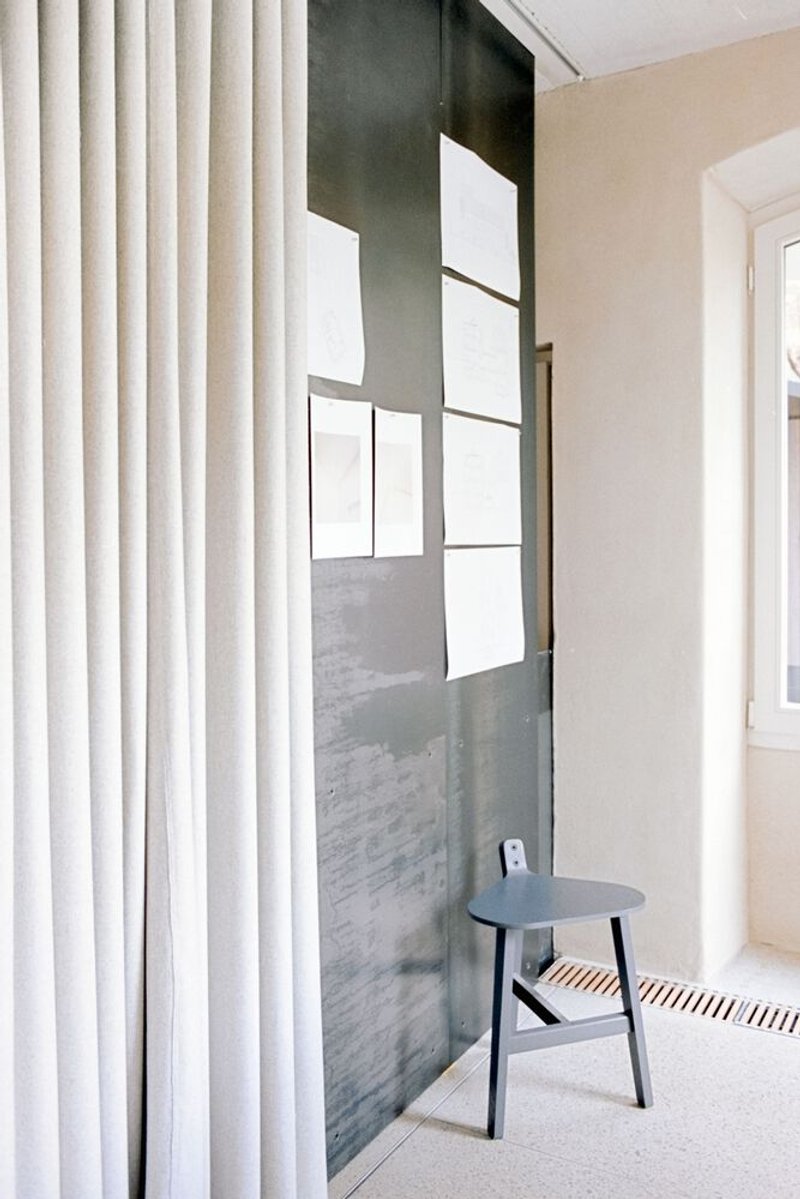 The renovation prioritized eco-friendly materials, such as Miscanthus clay for insulation in the studio. The use of natural lime for interior and exterior finishes ensures a healthy indoor environment and highlights the building's sustainable credentials.
