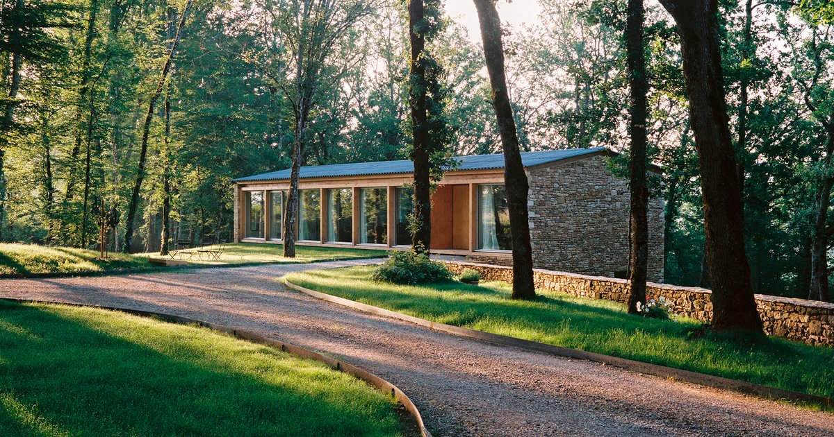 A serene guesthouse by SAPIENS ARCHITECTES, blending stone, wood, and glass, harmoniously nestled within Valojoulx’s oak forest.