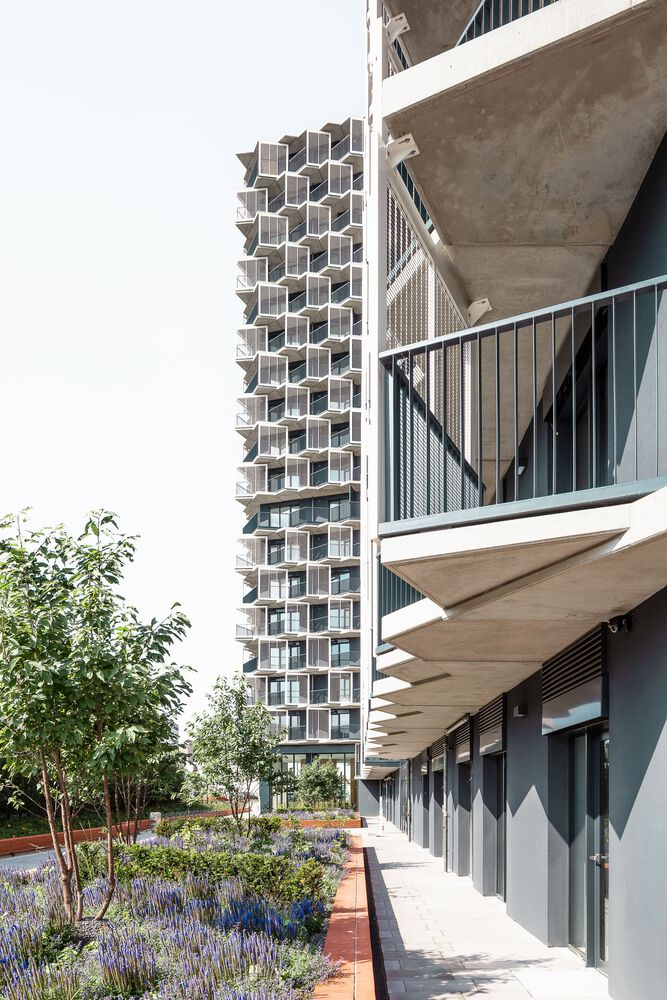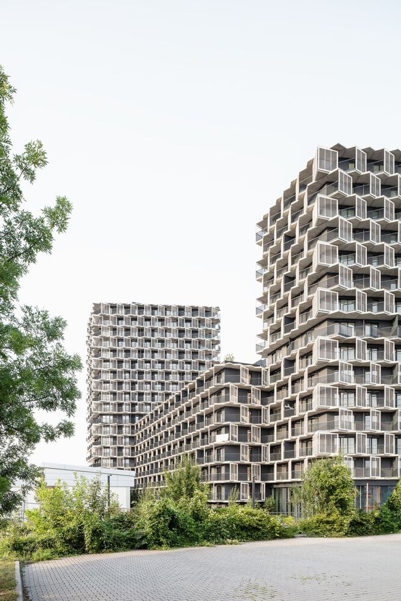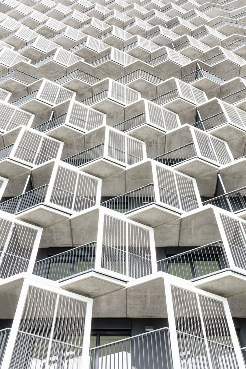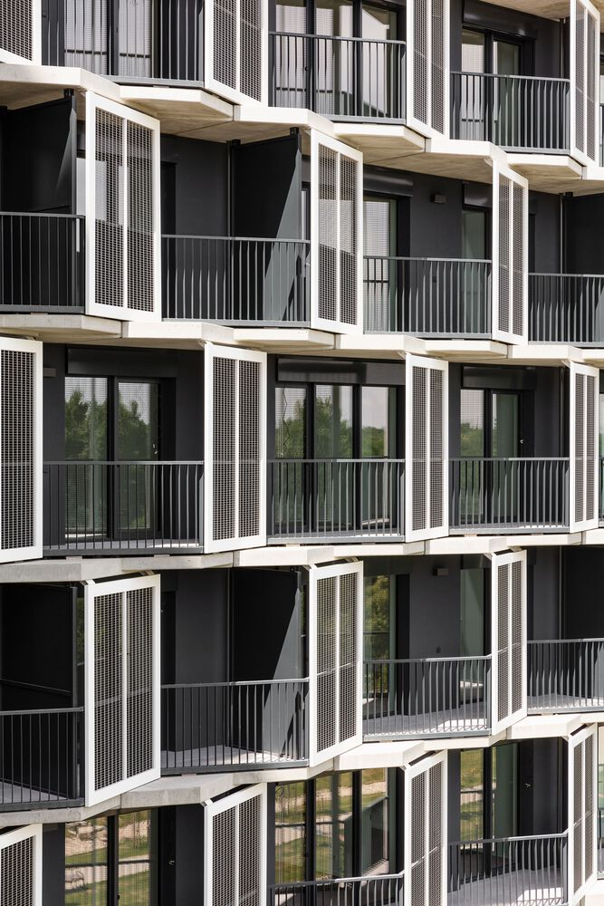 The facade design is Guthaus’s most defining architectural element. Characterized by cubiform loggias, the bold geometric structure forms a three-dimensional building skin that expands outdoor living space while shielding residents from sun, wind, and rain. These loggias blur the boundary between private and public, creating thresholds that invite interaction, relaxation, and contemplation.