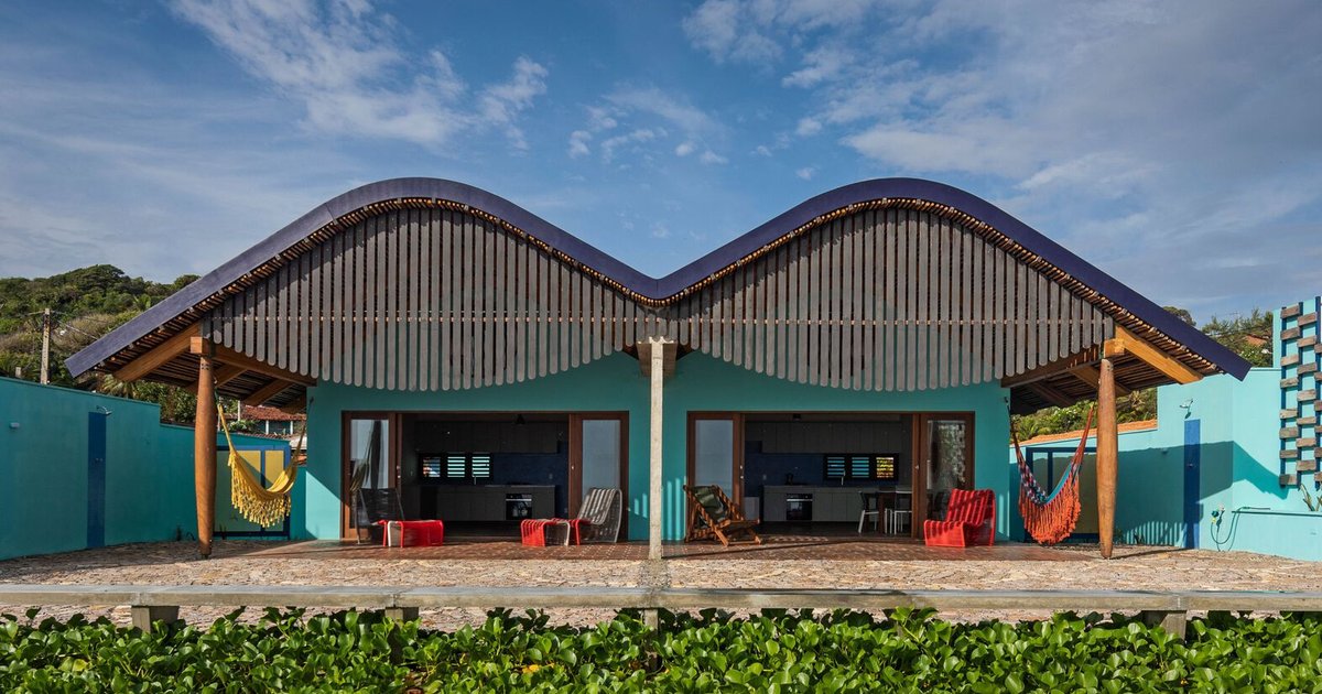 Gutter House by Atelier Daniel Florez: paired Brazilian beach houses inspired by maritime heritage, featuring curved wooden waves, blue accents, and sustainable design.