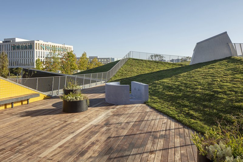 The rooftop terrain extends the play area across multiple levels, offering children safe outdoor environments for movement and discovery. Some sections are designated as interactive playgrounds, while others remain untouched landscapes, fostering a sense of exploration and adaptability.