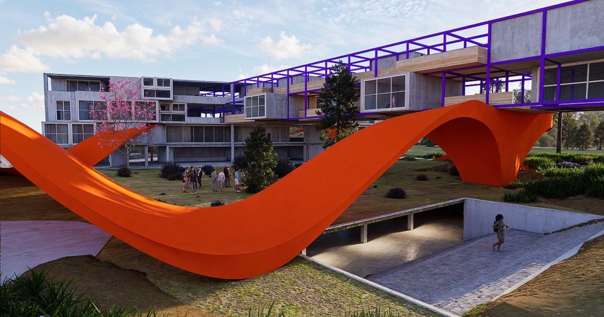 The bright orange pedestrian pathway, flowing across the site like a sculptural ribbon, becomes both a symbolic and functional bridge, guiding users through the landscape and linking built and natural elements seamlessly.