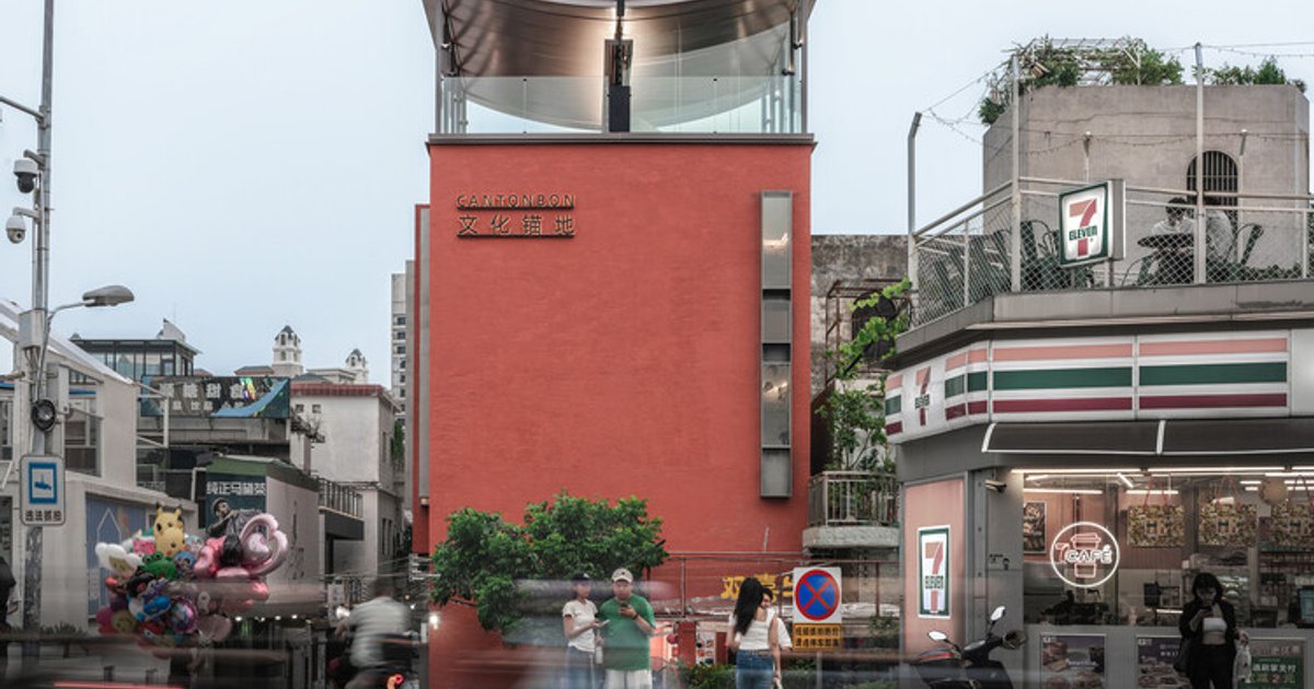 PMT Partners honoured the building’s past by preserving raw concrete slabs, red-brick walls and narrow alley setbacks. The facade’s slender vertical windows frame views out to life in the street and invite interaction. Interior floors reflect old/new: antique red tile pod flooring meets a display wall from 500 mm to 2,900 mm height — new layer over historical base. The building becomes a timeline in built form.