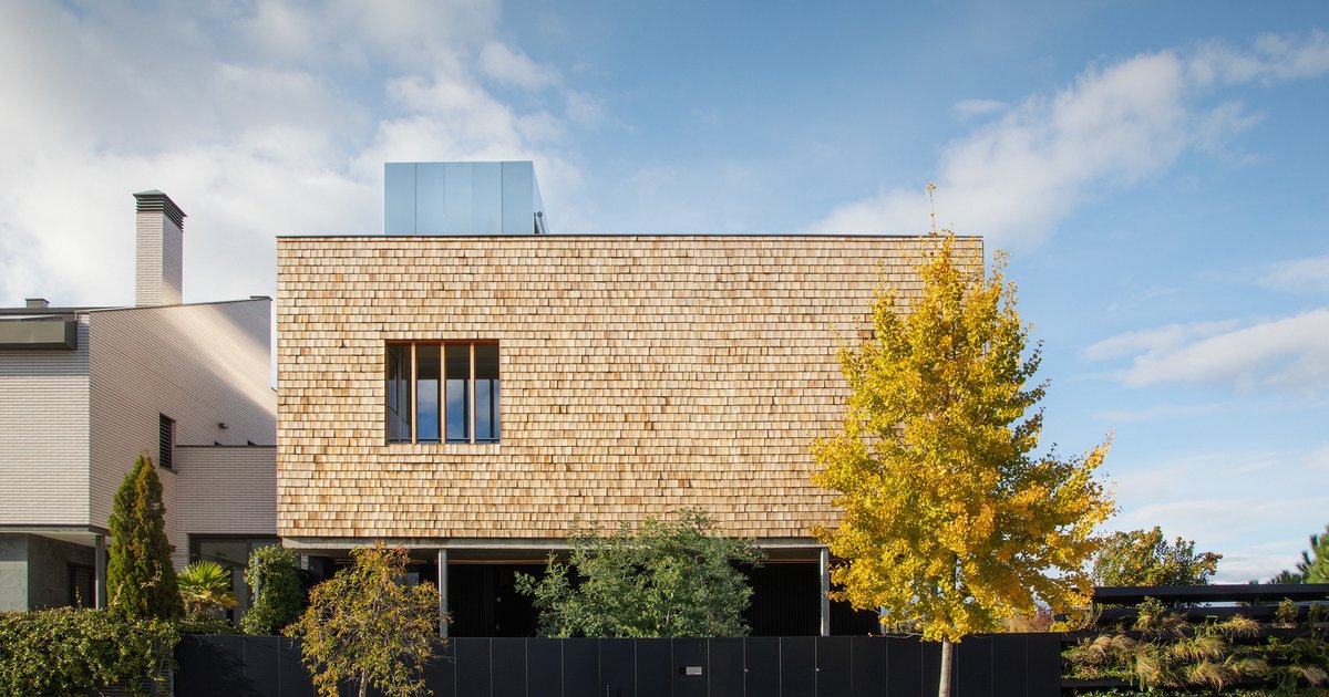 Rising above the sunken base, a lightweight timber-clad upper volume rests on slender supports, housing the private areas of the residence. This level aligns with the neighboring rooftops, maintaining urban continuity while offering elevated views of the adjacent park. The façade is constructed with ventilated wooden shingles, diverging from the area’s typical brickwork. This not only improves thermal performance but also gives the home a warm, tactile quality and a distinctive identity.