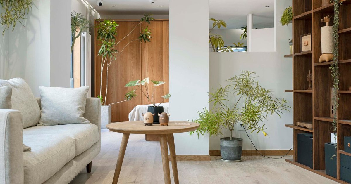 Unlike traditional showrooms, furniture is arranged along the perimeter, leaving the center open. This central void takes advantage of the 7-meter-high ridge to create a vertical ‘inner courtyard’. Plain plaster walls divide areas, while square openings maintain visual connections and create layered spatial experiences. This contrast between enclosed interiors and the external park environment enhances depth and engagement.