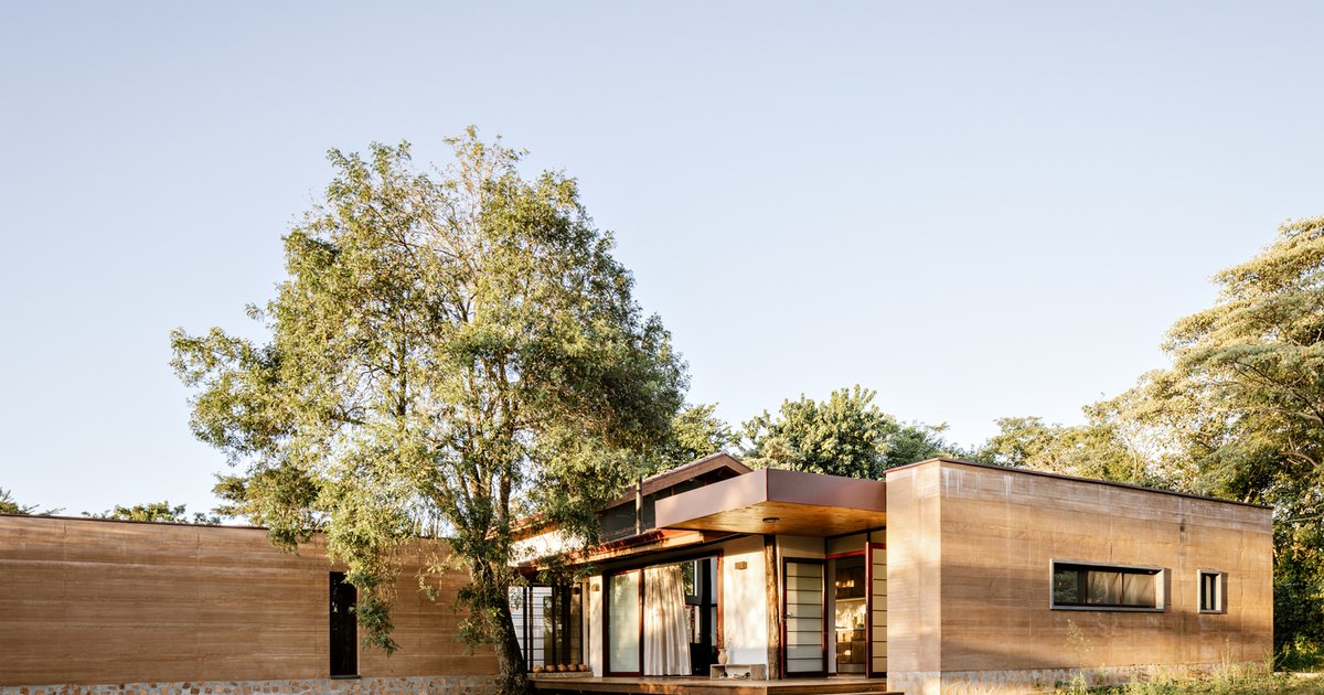 Hibiscus House blends sustainable architecture with nature, featuring rammed earth walls, recycled materials, and an artist residency in Brazil.