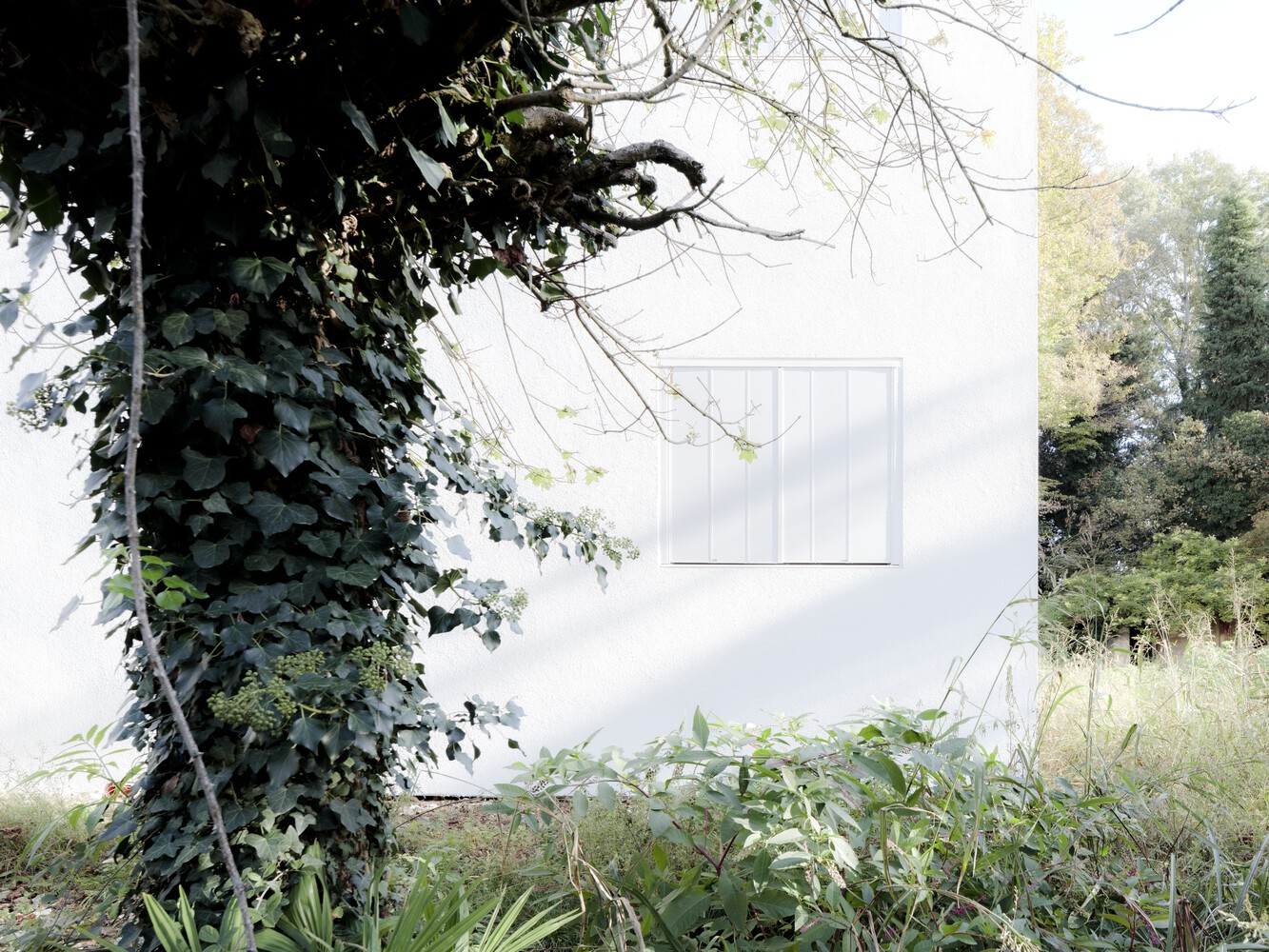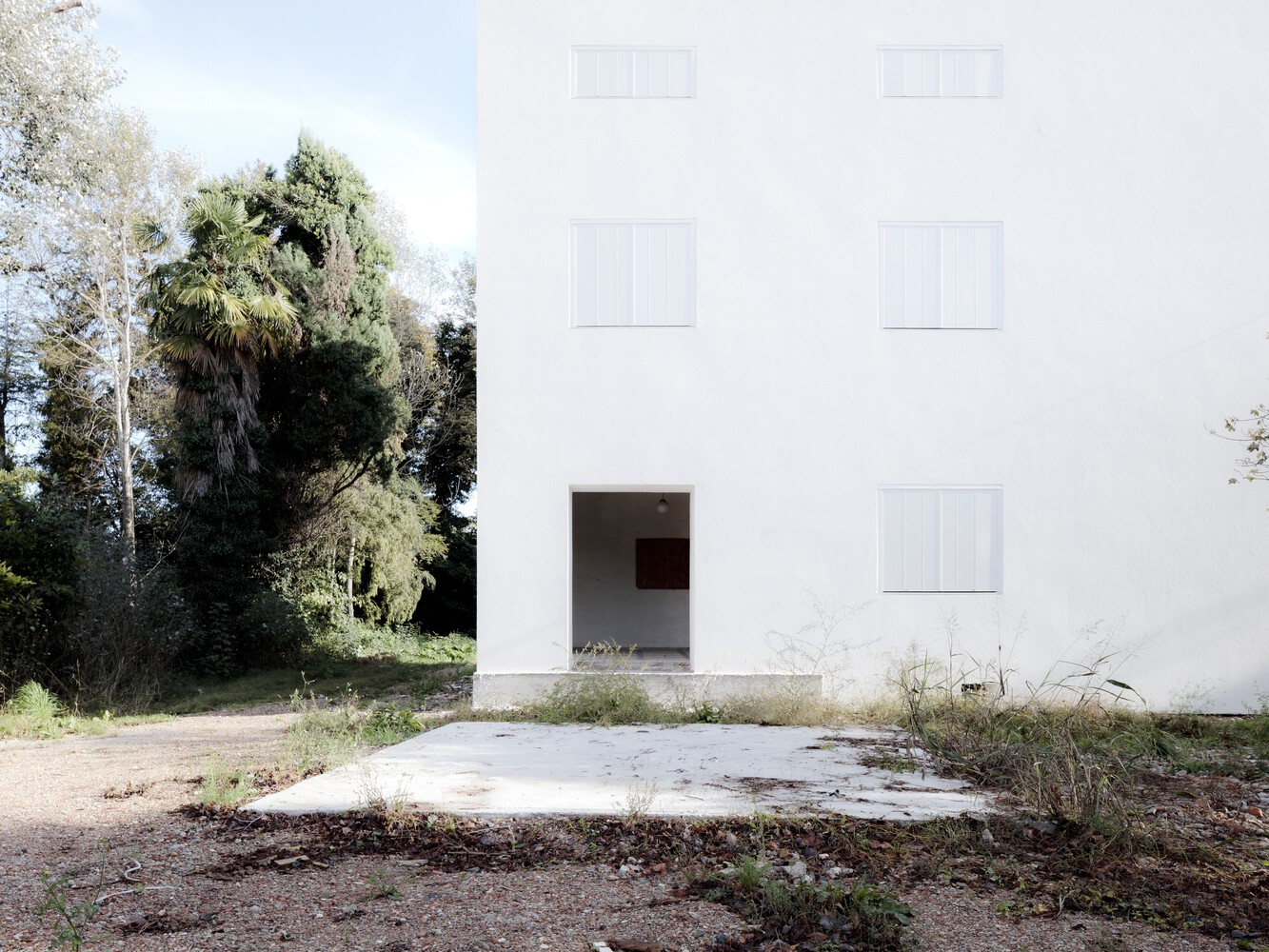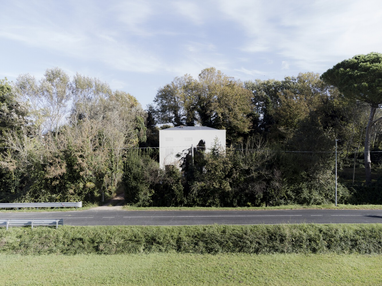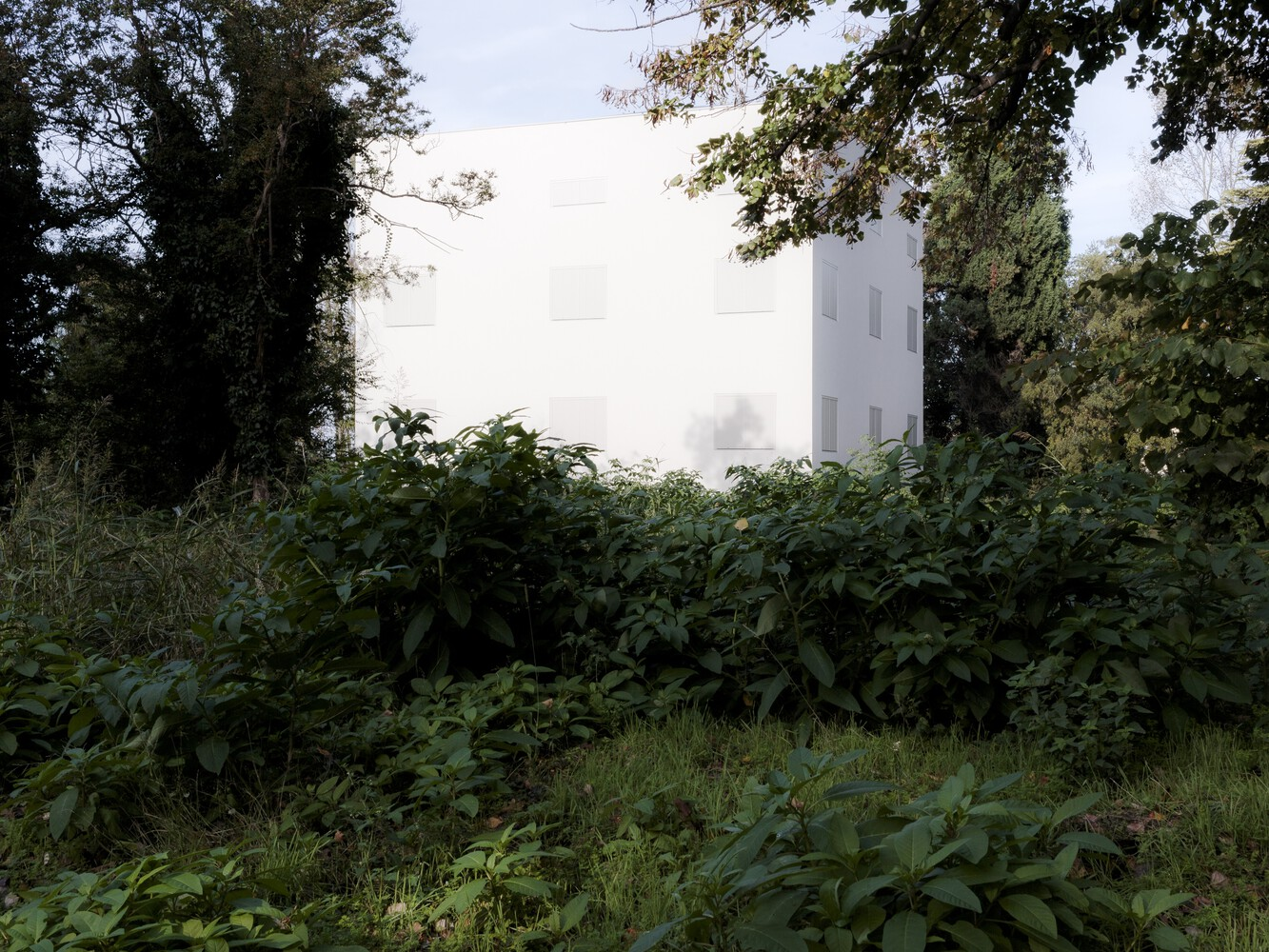 Through a process of rebalancing its architectural envelope, the villa was returned to a state of neutrality. Its striking white cubic form, once lost amid neglect, now stands as a renewed landmark in the landscape. Rather than blending seamlessly with its surroundings, it engages in a deliberate contrast with the wild vegetation, forming a dialogue between structure and nature. Shadows cast by surrounding trees animate its facade, creating an ever-changing relationship between light, movement, and materiality.