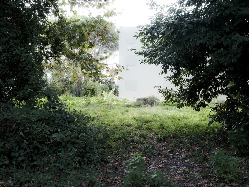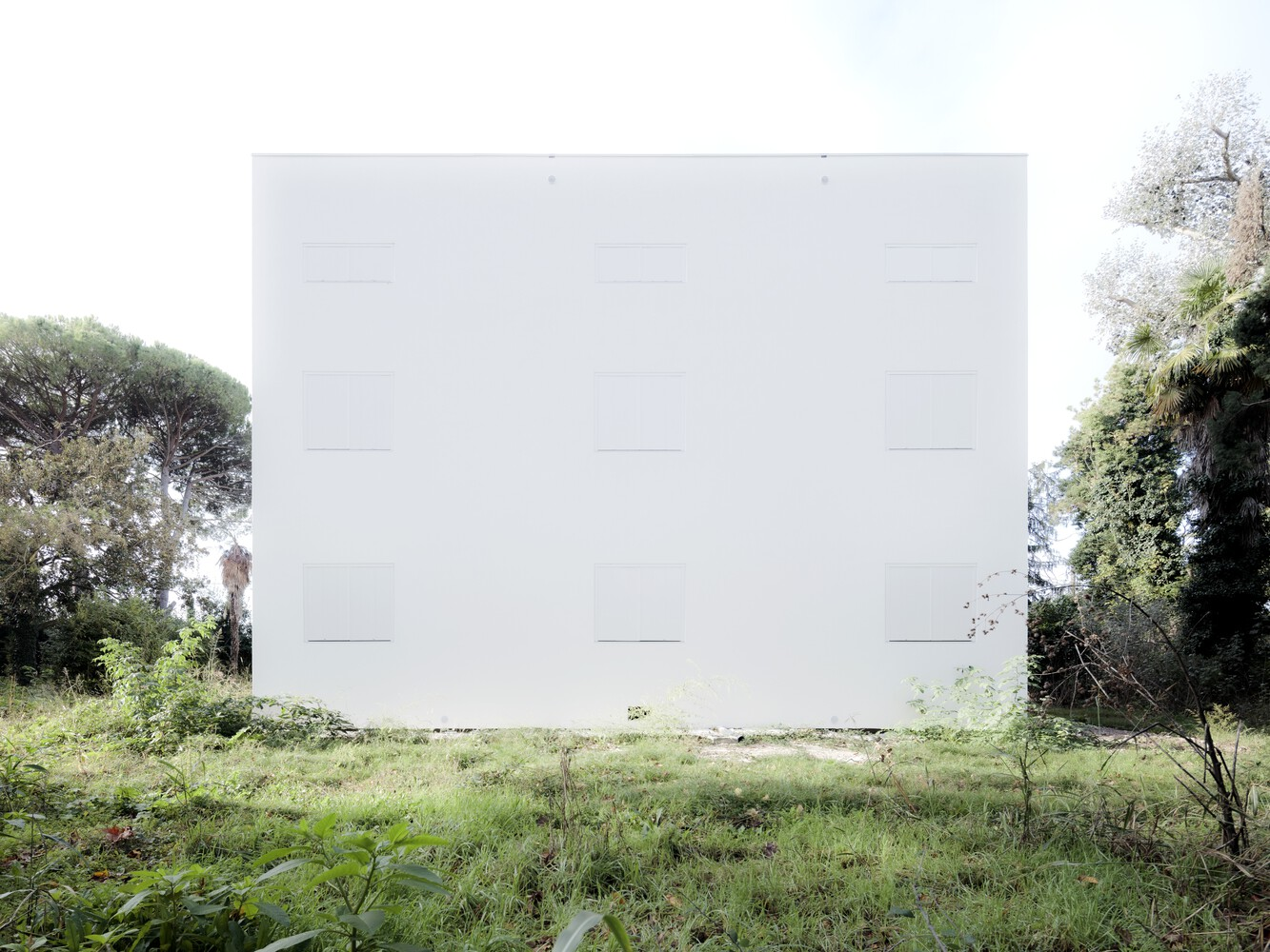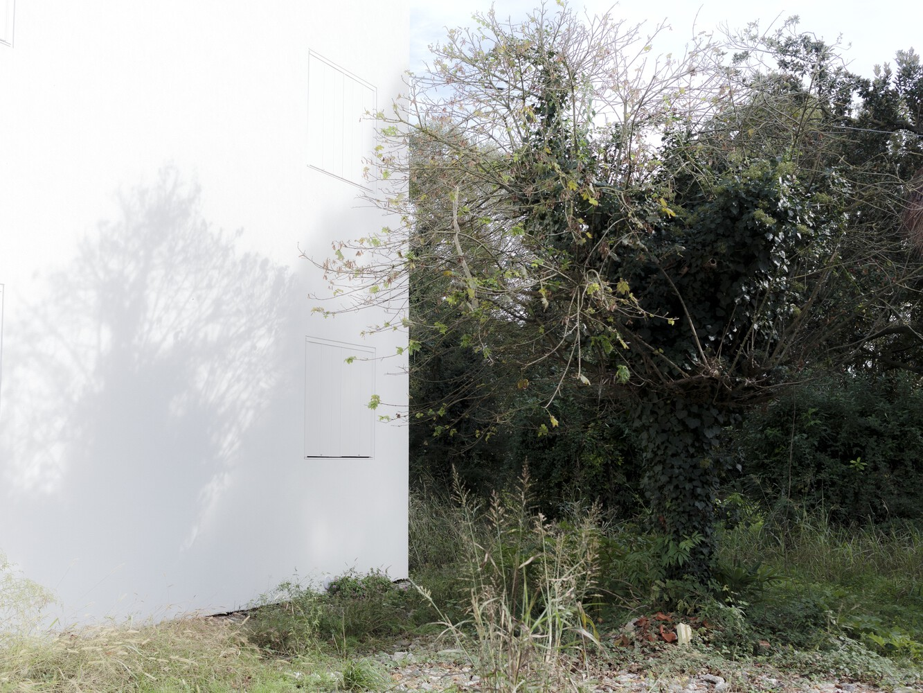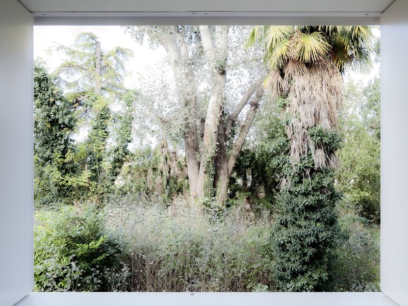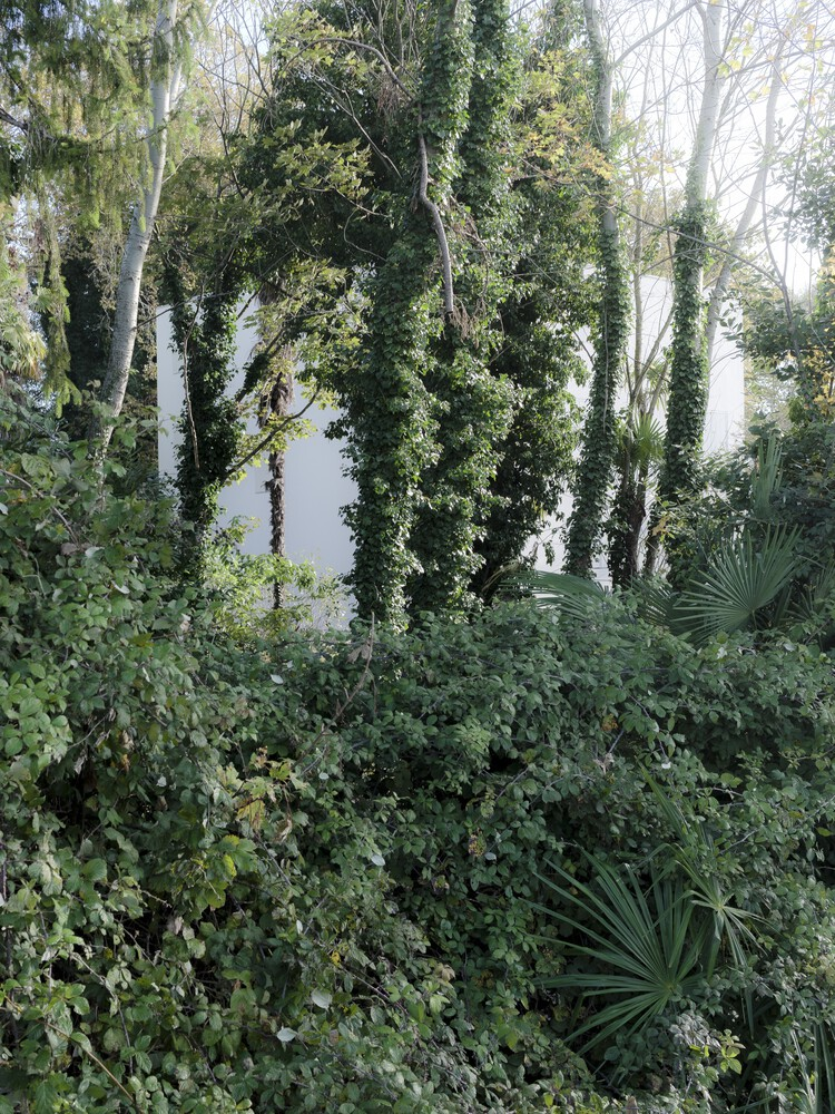 Through a process of rebalancing its architectural envelope, the villa was returned to a state of neutrality. Its striking white cubic form, once lost amid neglect, now stands as a renewed landmark in the landscape. Rather than blending seamlessly with its surroundings, it engages in a deliberate contrast with the wild vegetation, forming a dialogue between structure and nature. Shadows cast by surrounding trees animate its facade, creating an ever-changing relationship between light, movement, and materiality.