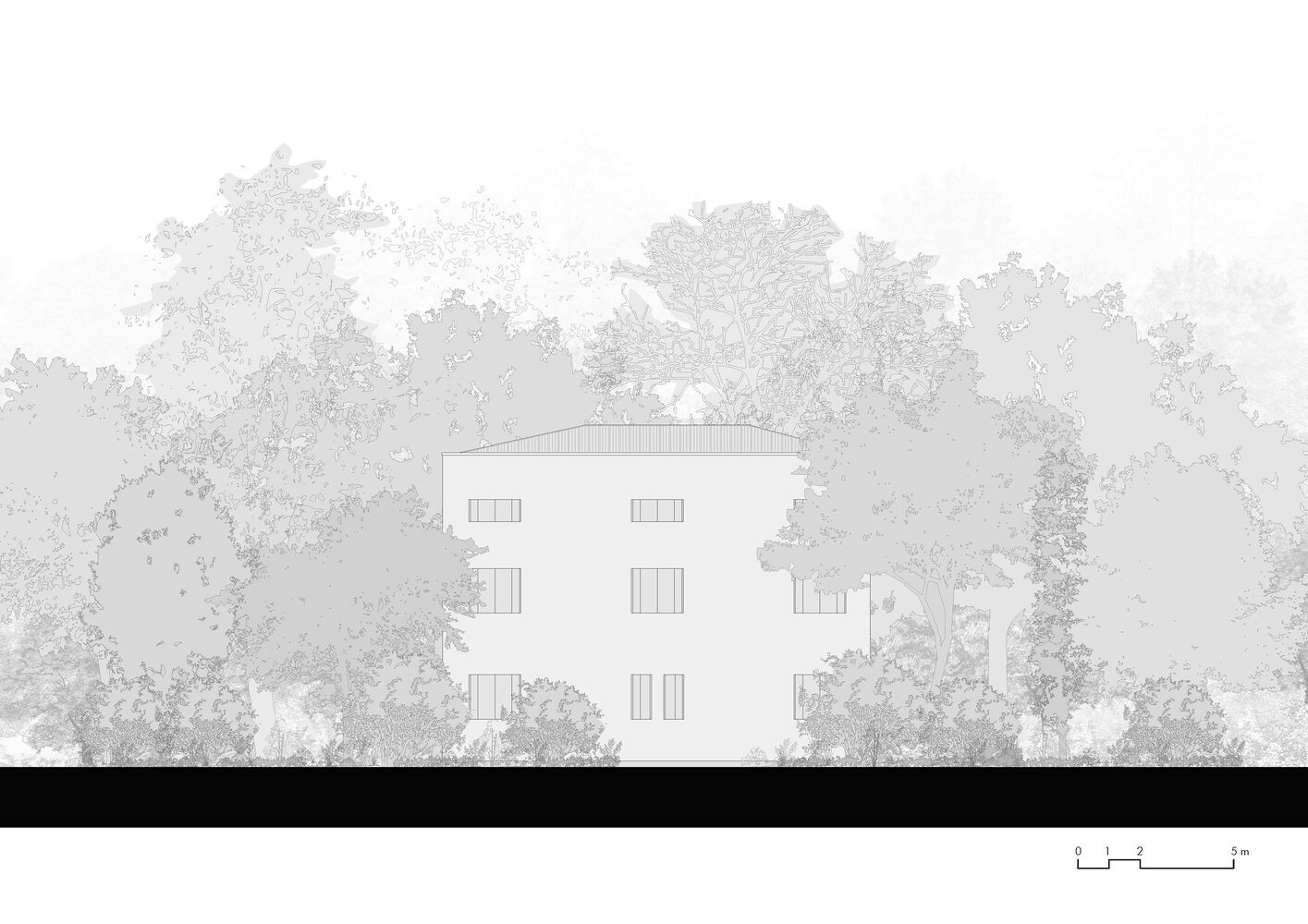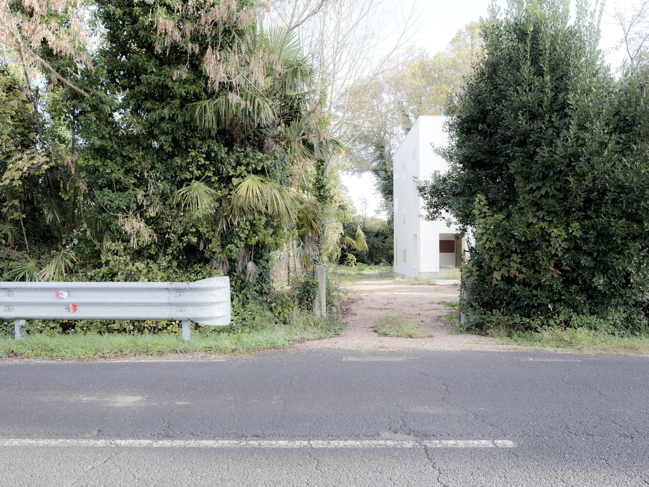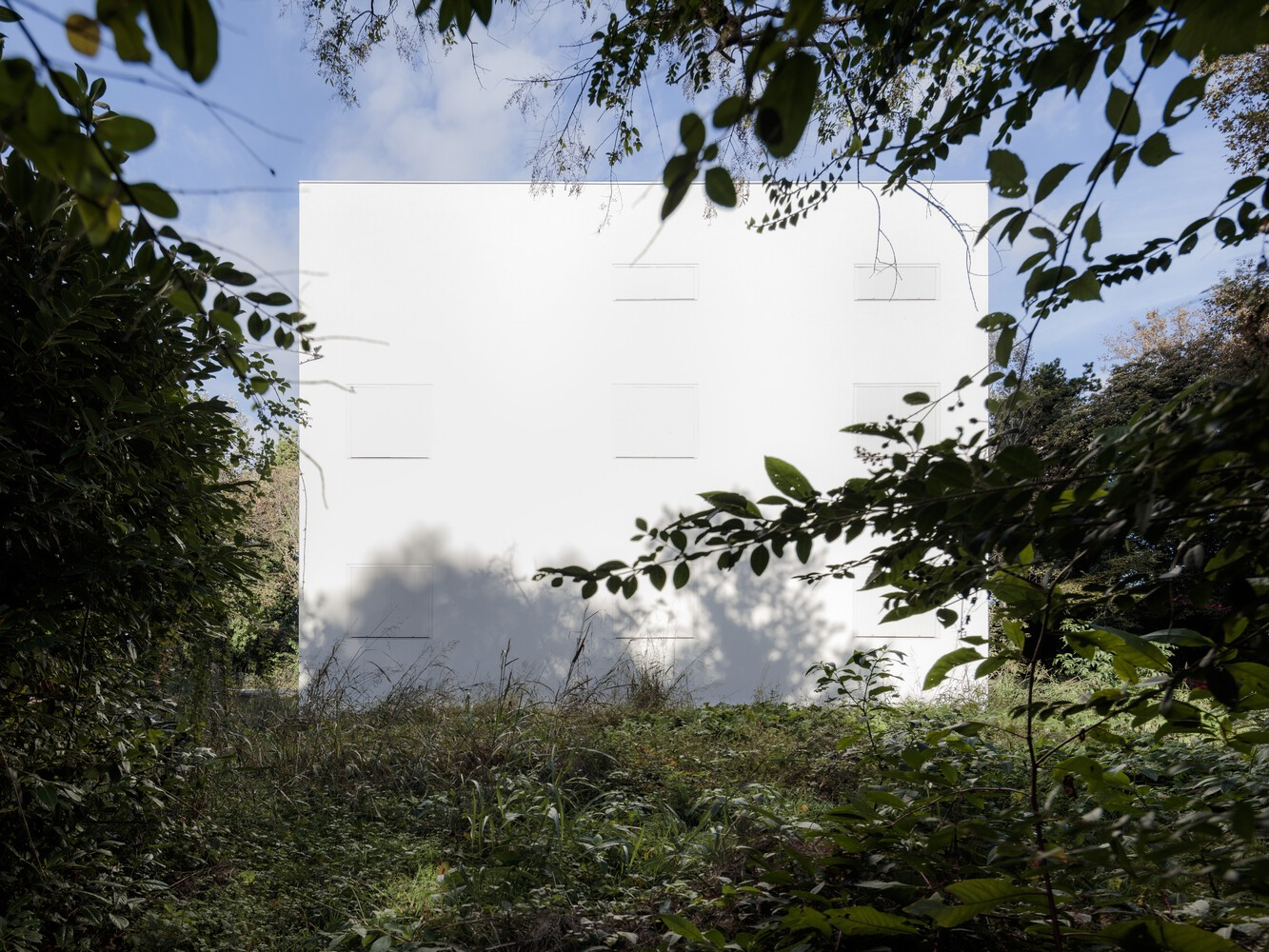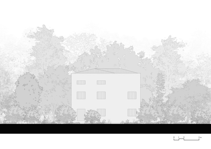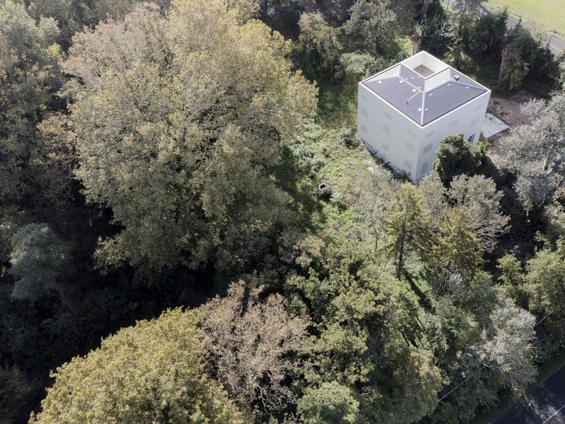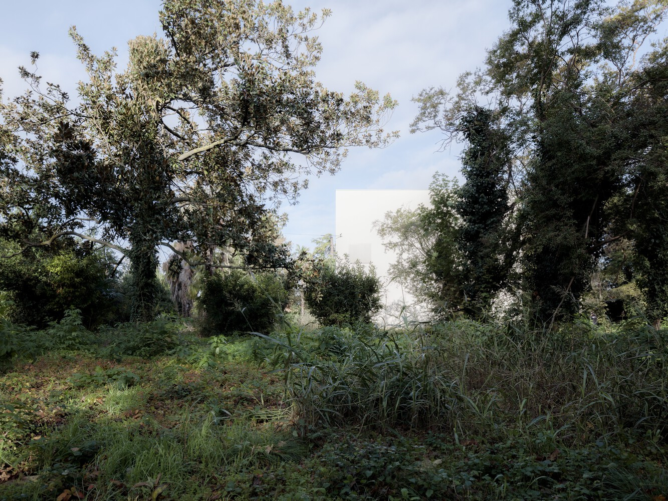 Through a process of rebalancing its architectural envelope, the villa was returned to a state of neutrality. Its striking white cubic form, once lost amid neglect, now stands as a renewed landmark in the landscape. Rather than blending seamlessly with its surroundings, it engages in a deliberate contrast with the wild vegetation, forming a dialogue between structure and nature. Shadows cast by surrounding trees animate its facade, creating an ever-changing relationship between light, movement, and materiality.