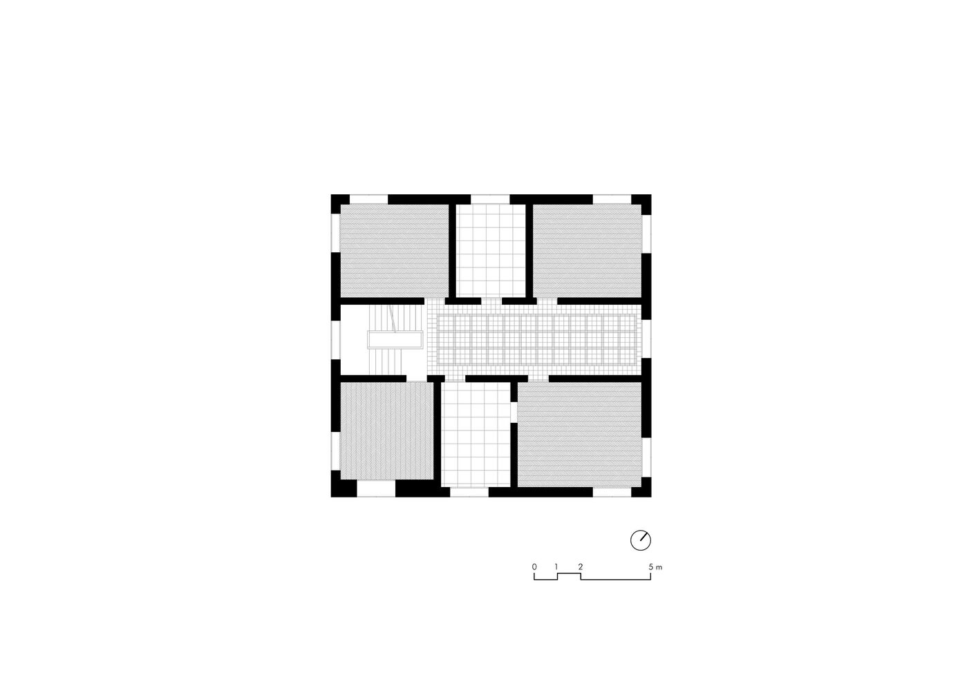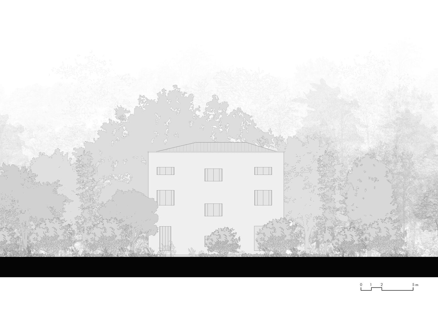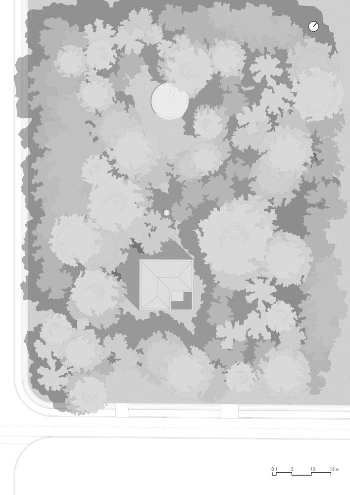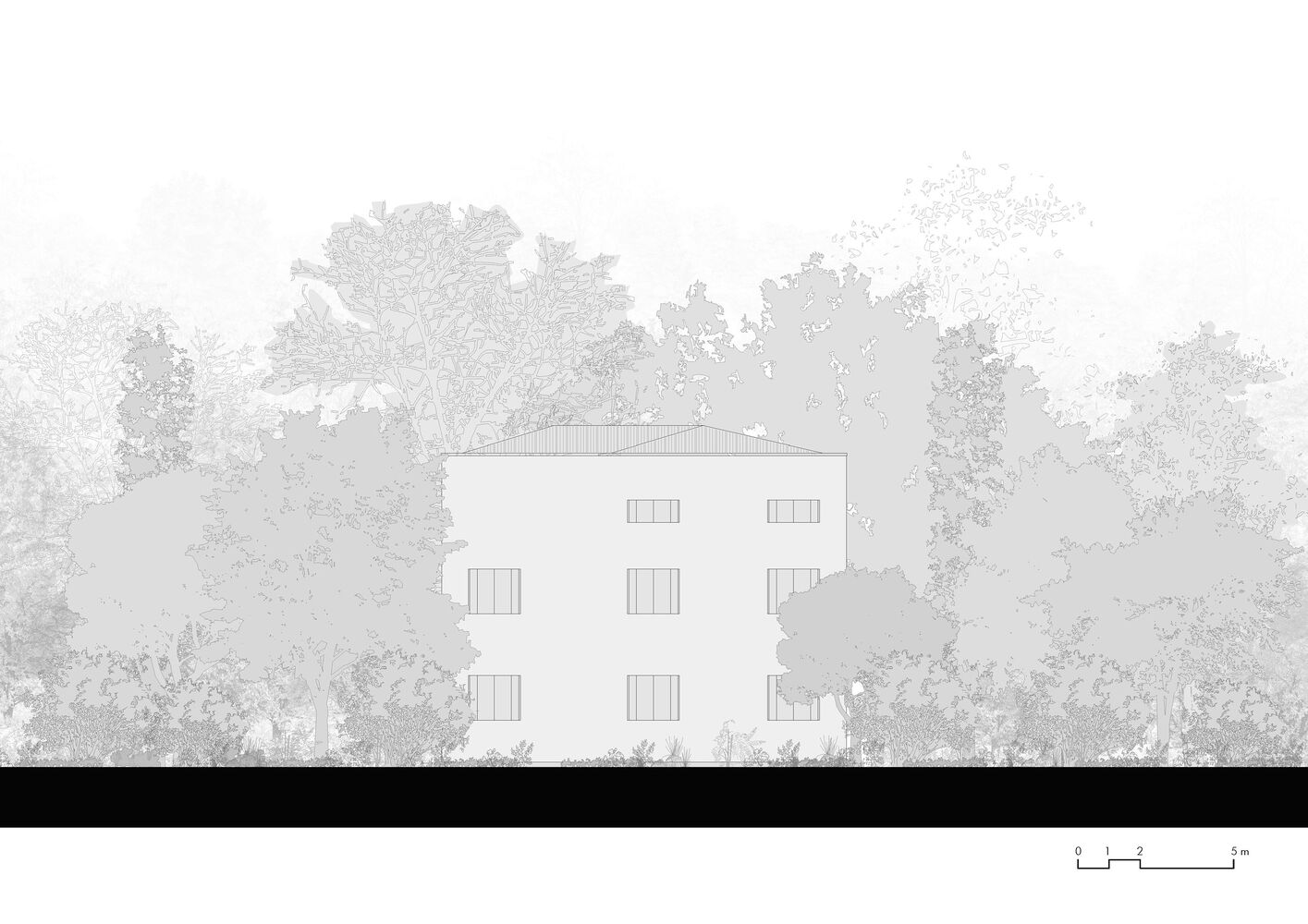 Through a process of rebalancing its architectural envelope, the villa was returned to a state of neutrality. Its striking white cubic form, once lost amid neglect, now stands as a renewed landmark in the landscape. Rather than blending seamlessly with its surroundings, it engages in a deliberate contrast with the wild vegetation, forming a dialogue between structure and nature. Shadows cast by surrounding trees animate its facade, creating an ever-changing relationship between light, movement, and materiality.