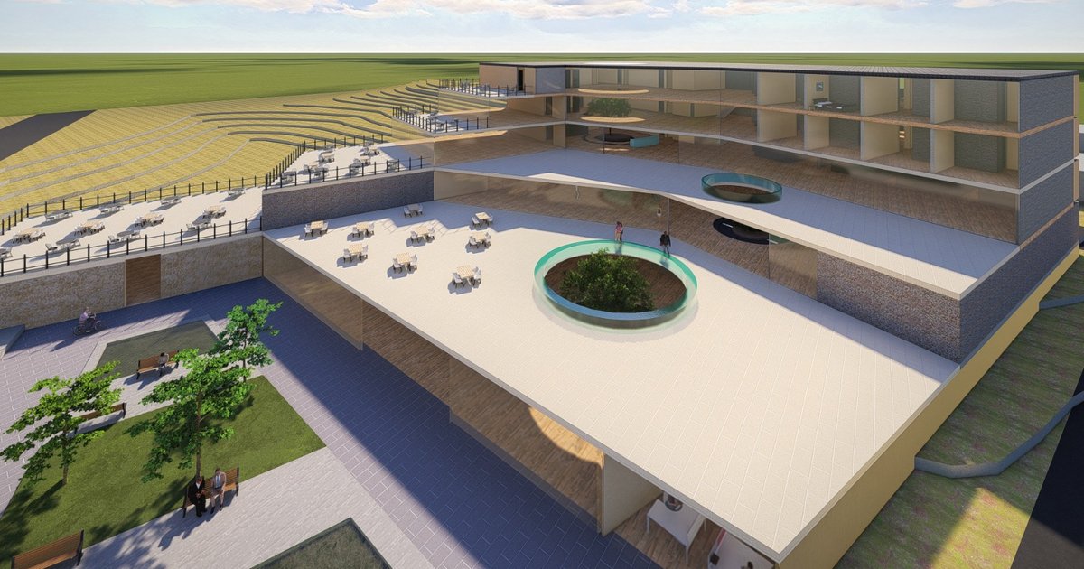 Yapı araziyi taklit edecek şekilde tasarlanmıştır. Topoğrafyayı temsil eden eğim çizgileri, öldüğü binanın sınırlarını oluşturmak üzere düzenlenmiştir. Katmanlar geri çekilmiştir. Bir olasılık olarak açıkça belli olmayan bir yapı biçiminde düzenlenmiş düzlemler programı, onu bir mekana dönüştürür. Özellikle alt katlarda, biri indikçe artan bina derinliğinin neden olduğu iç ve dış güneş ışığı sorununu çözmek için galeriler ve avlular mekana gün ışığı sağlar. Ortak alanların farklılaştırılması, bunların benzersiz ve nitelikli mekanlar olmasını sağlar.