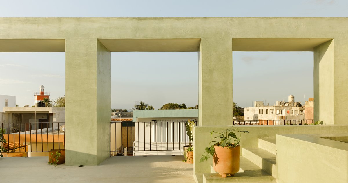 The most immediately striking element of Hotel Florita 39 is its green façade, achieved with a richly pigmented plaster that blends seamlessly with the vivid palette of Isla Mujeres. This façade is more than surface-level—it is deeply structural, composed of rigid frames and angular forms that create rhythmic openings and voids across the structure.