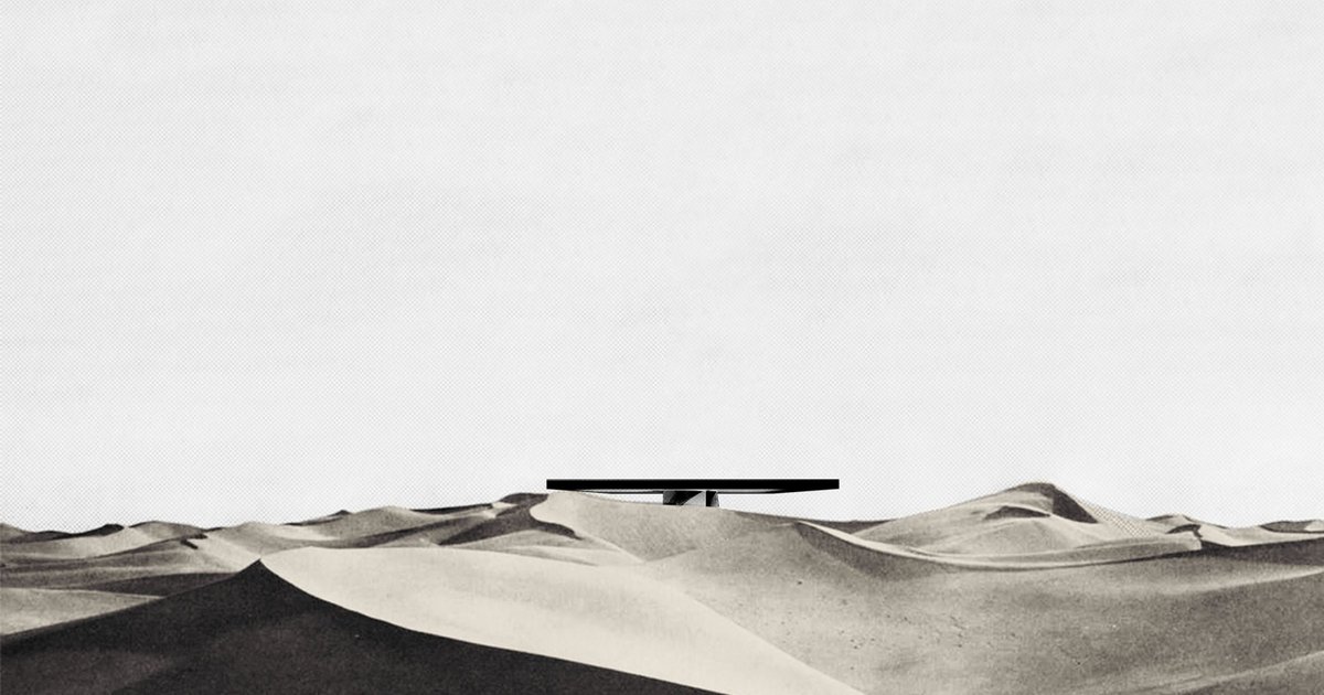 The formal language of Hourglass is deliberately restrained. A thin horizontal slab, supported by a recessed structure, creates a strong geometric contrast against the organic desert context.