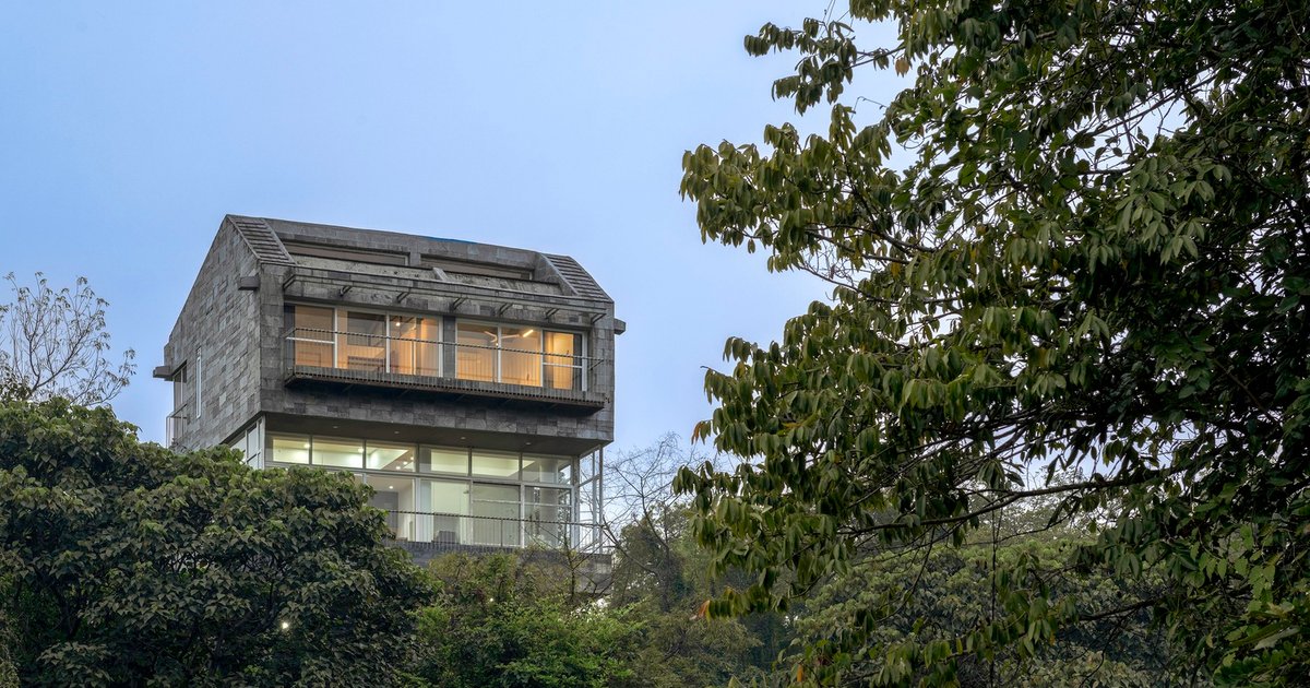 Horizontally, House 300 is divided into three volumes, each reflecting its function. The lower living space is entirely transparent, offering 270° panoramic views, seamless connections to the dining and kitchen areas, and a stilted outdoor space perfect for monsoon afternoons. Above, the bedrooms are constructed with reinforced concrete and clad in black slate, with skylights and deep verandas protecting against harsh monsoon rains while allowing natural light to penetrate interiors.