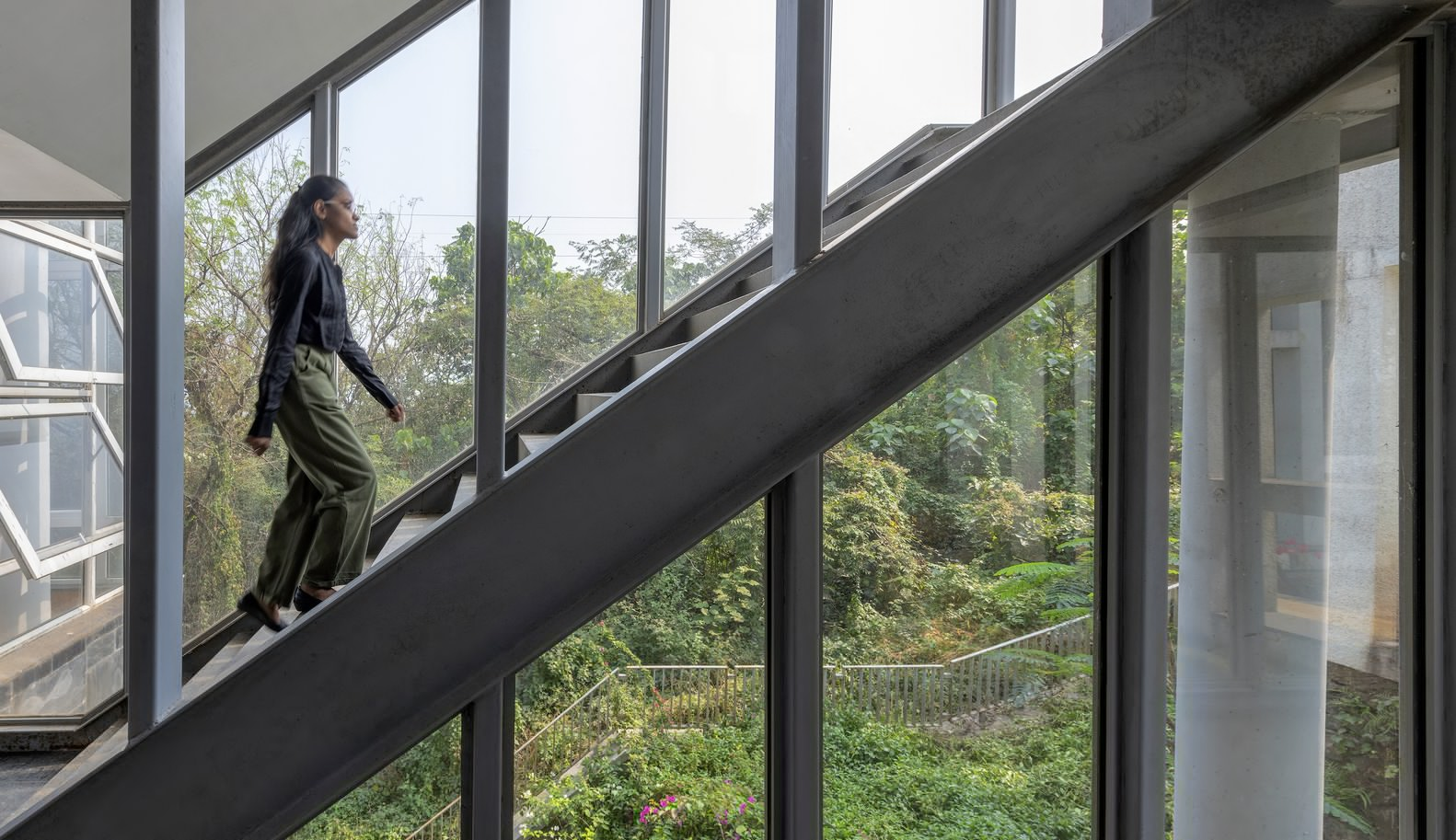A Steel-and-Glass Bridge connects the Open Room to the elevated Main House. The bridge serves as vertical circulation, creating a dynamic interplay between the lower courtyard and upper living spaces. At nearly 9 meters above the natural slope, the Main House emerges as a transparent lower level crowned by solid, heavy upper volumes housing the bedrooms.