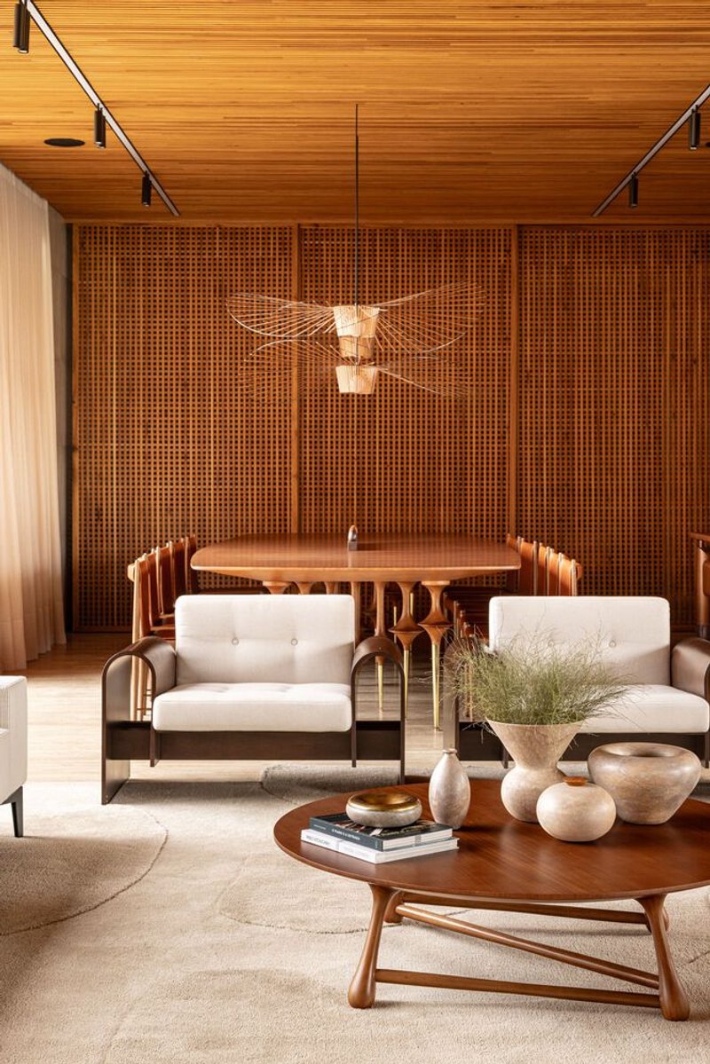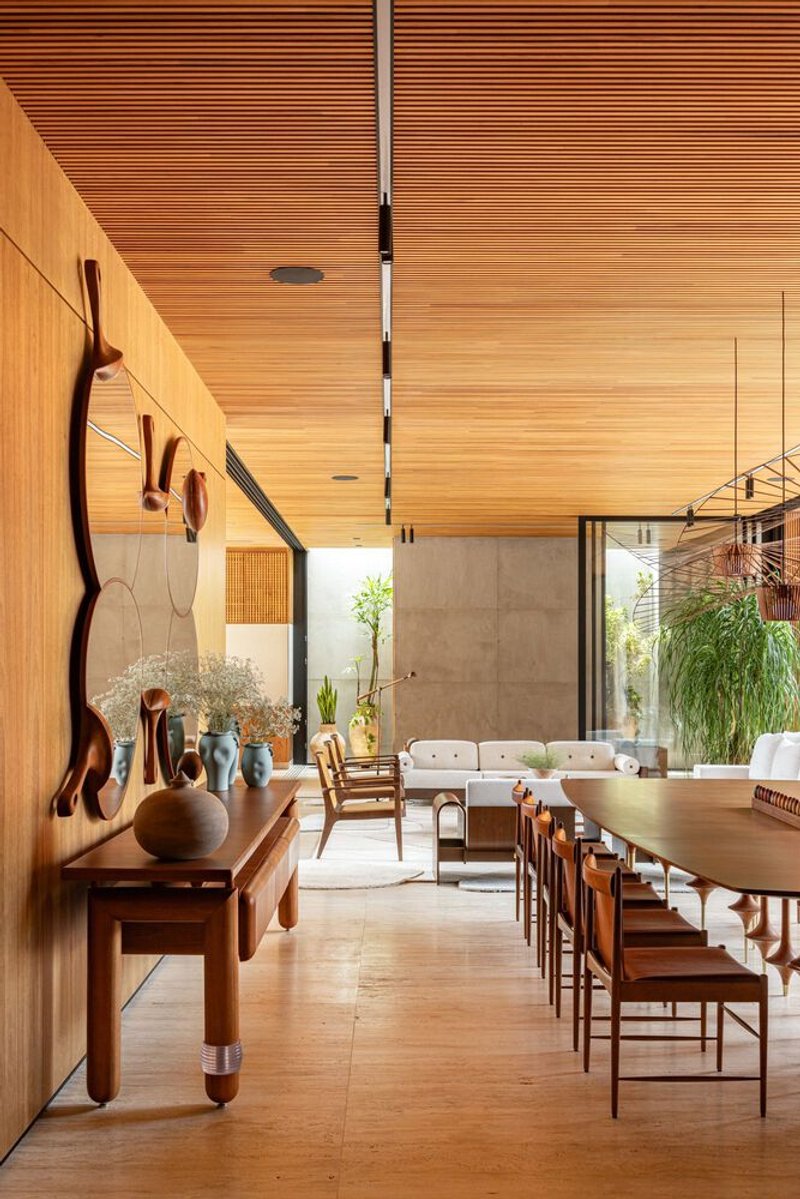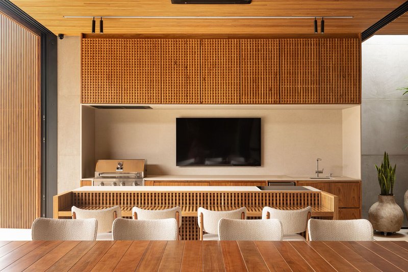 Natural materials, especially wood, guide the composition. Freijó wood panels, muxarabi screens, and bespoke furnishings define both texture and tone throughout the home, weaving continuity from outside to inside.