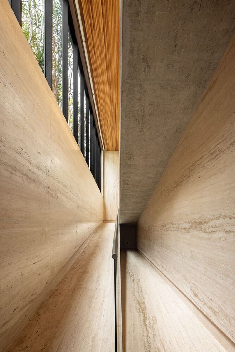 A travertine staircase, lit by generous glazing, leads to the basement, where utility and design coexist seamlessly. The lower level includes a garage with raw concrete finishes, service areas, a playroom, and storage zones—evidence of Romano’s ability to balance poetry with practicality.