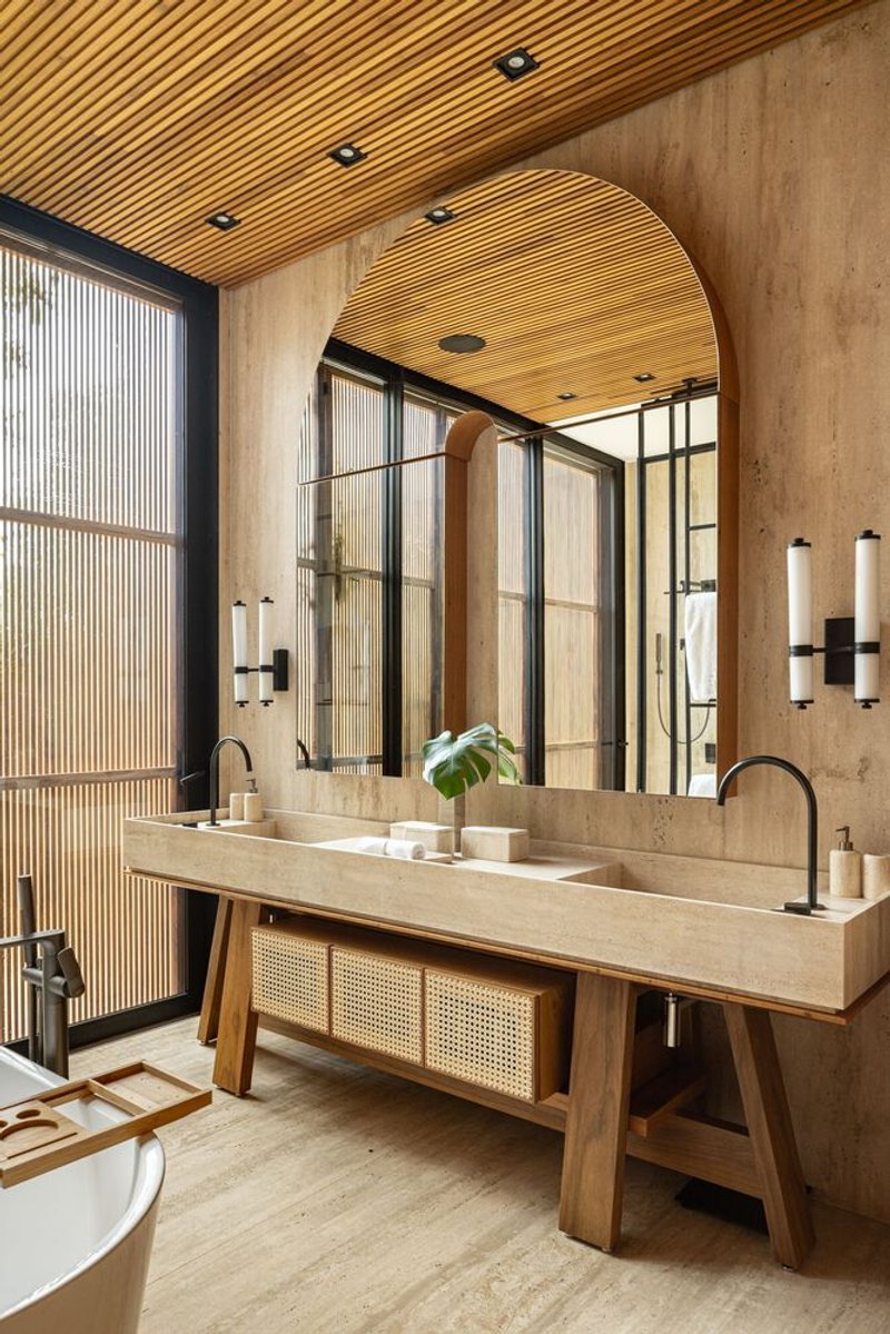 The bathroom attached to the suite opens onto a secluded garden, blurring the line between architecture and landscape. Natural ventilation and daylight animate even the most intimate moments of the house.