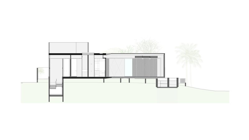 The house unfolds from the corner lot with a subtle projection of its ground floor, a gesture that roots the home into the land as if the earth gently folds around it. The architecture embraces its site without excess, respecting both its urban position and the private nature of its residents.