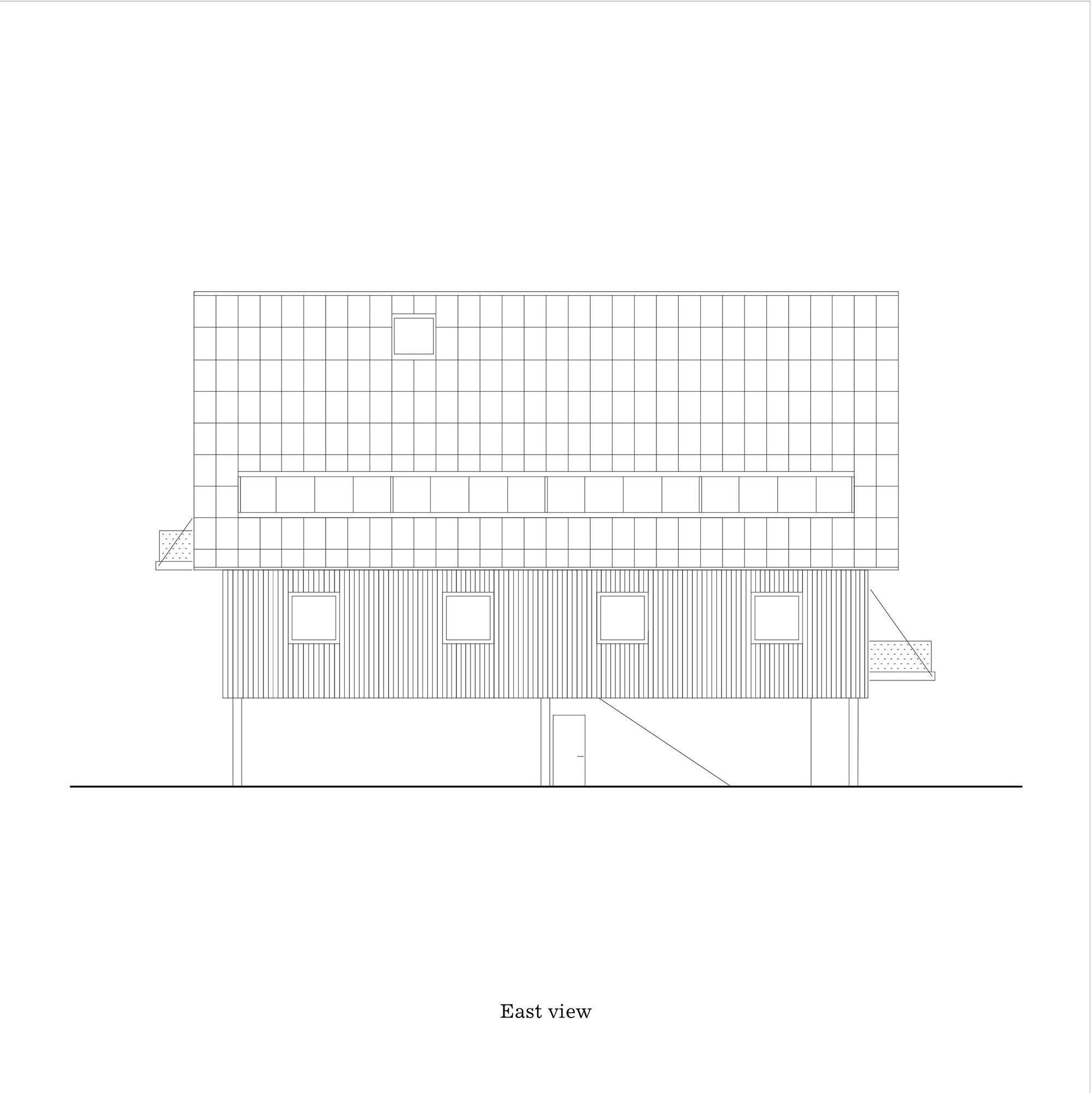 To protect the straw bale foundation from water damage, House Hoinka is elevated one full story above ground. Resting on a concrete cross and four supports, the home appears like a floating wooden monolith.