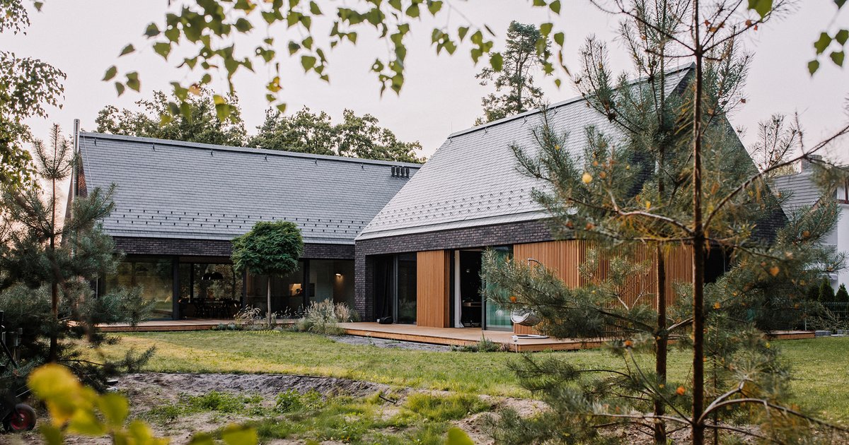 Contemporary barn-inspired house in Dobra, Poland, blending brick, wood, and slate with forest views, sustainable site integration, and minimalist detailing.