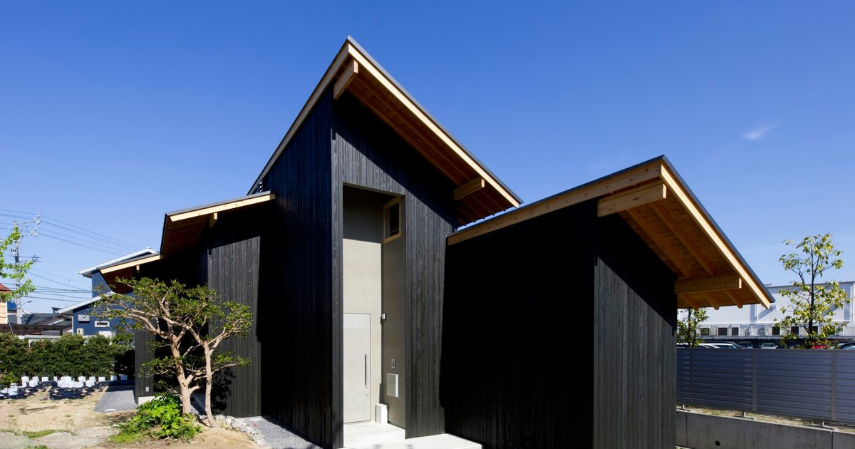 Minimalist Japanese home blending privacy and nature, featuring sloped roofs, garden integration, and seamless indoor-outdoor living on a compact site.