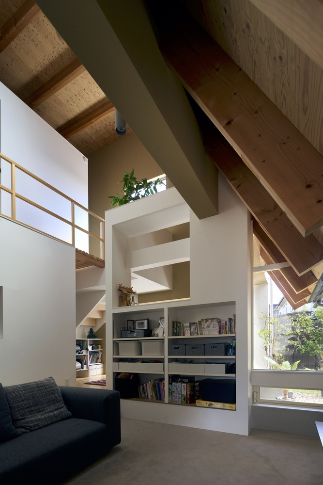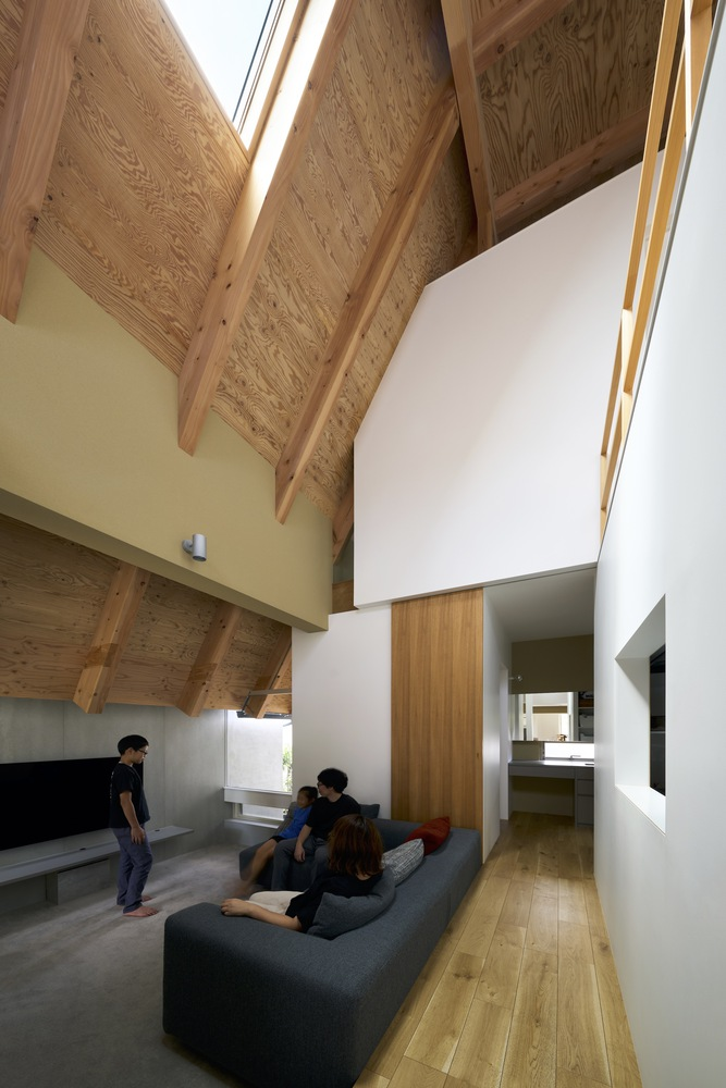 Compact pitched-roof house in Kosai featuring stacked volumes, spatial misalignments, double-height living, and interconnected family spaces filled with shifting light.