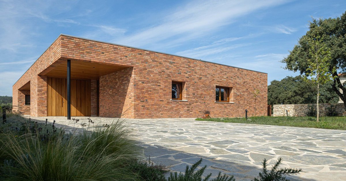 Materiality is central to the identity of the House in Lameira by João Pedro Pedrosa. The standout element is the handcrafted solid brick cladding that wraps the entire façade. Each brick is unique, produced by a local artisan whose final contribution to the craft was for this very home. When production fell short, the homeowner and his son actively joined the process to ensure the project’s completion, reinforcing the home’s narrative of craftsmanship and family.