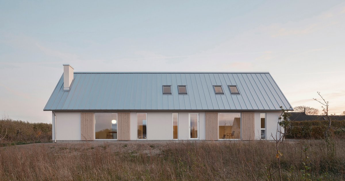 Set within a landscape defined by farm structures and open fields, the house draws inspiration from the region’s agricultural character. Its simple, legible volume and pitched zinc roof echo the logic of surrounding barns, reinforcing visual continuity within the rural setting.