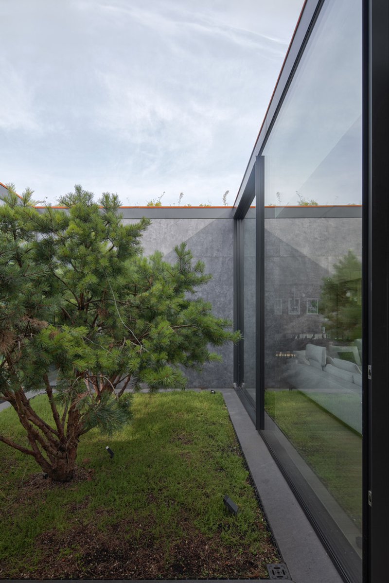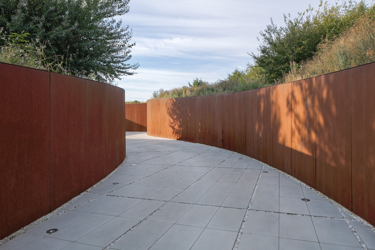 The building’s façades and driveway edges are clad in robust corten steel panels, their rich, earthy tones complementing the surrounding terrain. The heavy steel plates lend the buried structure a muscular, grounded character, while weathering naturally over time to echo the colors of soil and vegetation.