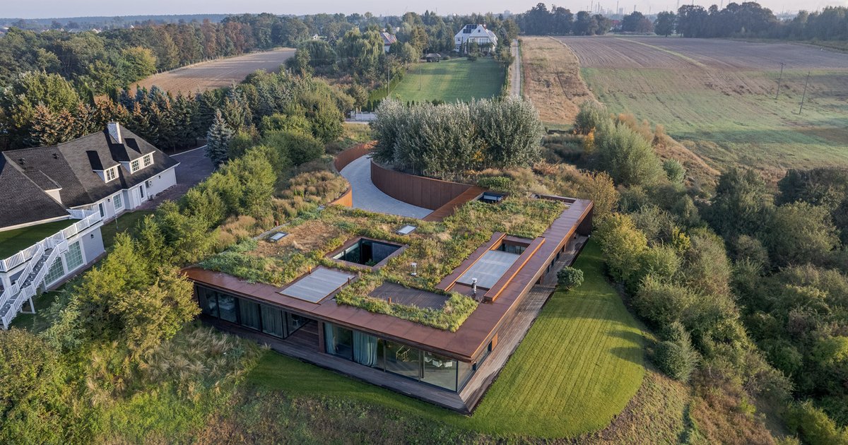 A modern riverside home in Poland seamlessly embedded in a slope, blending corten steel, green roofs, and panoramic Vistula views.