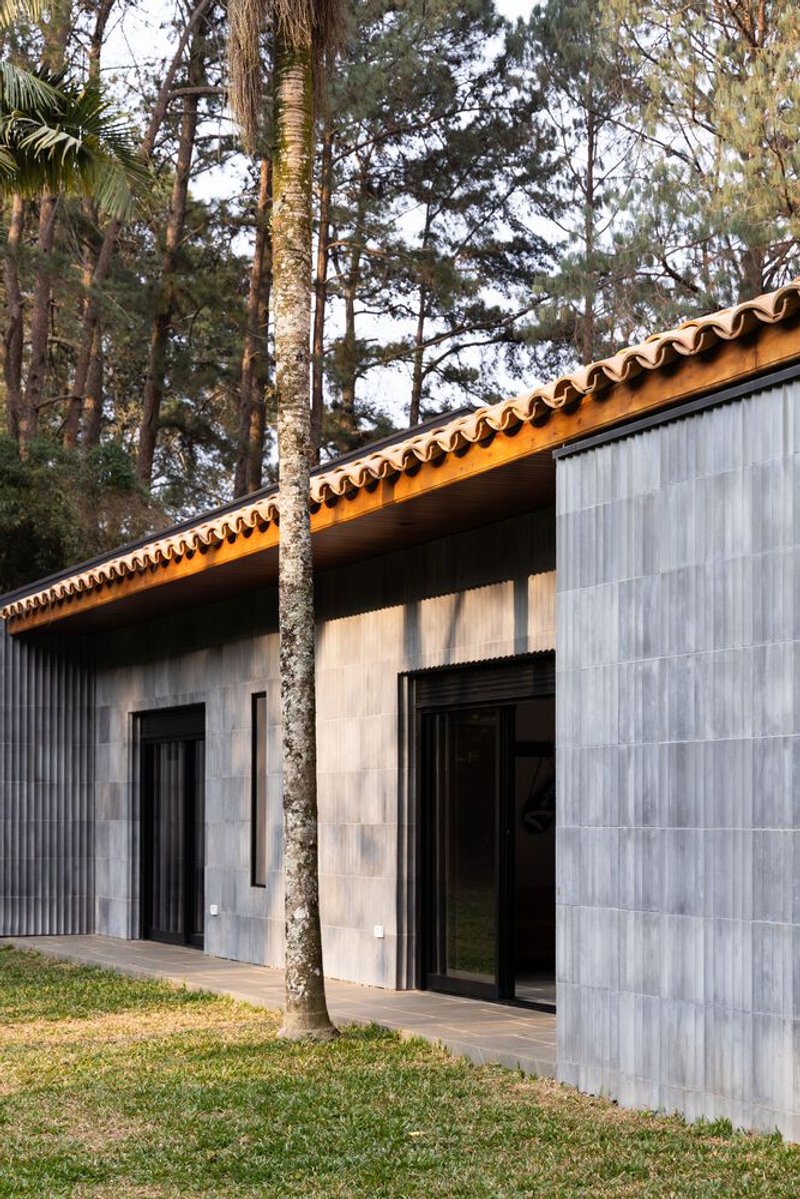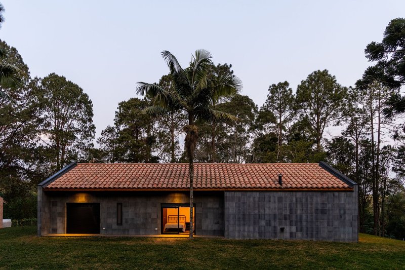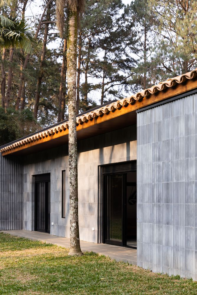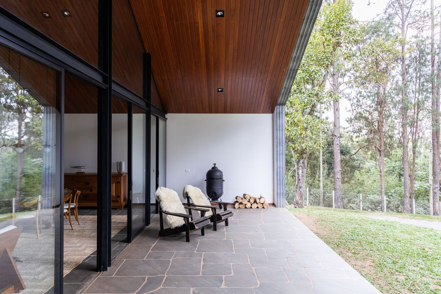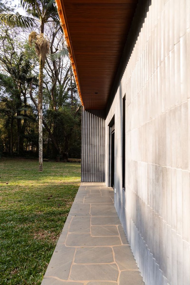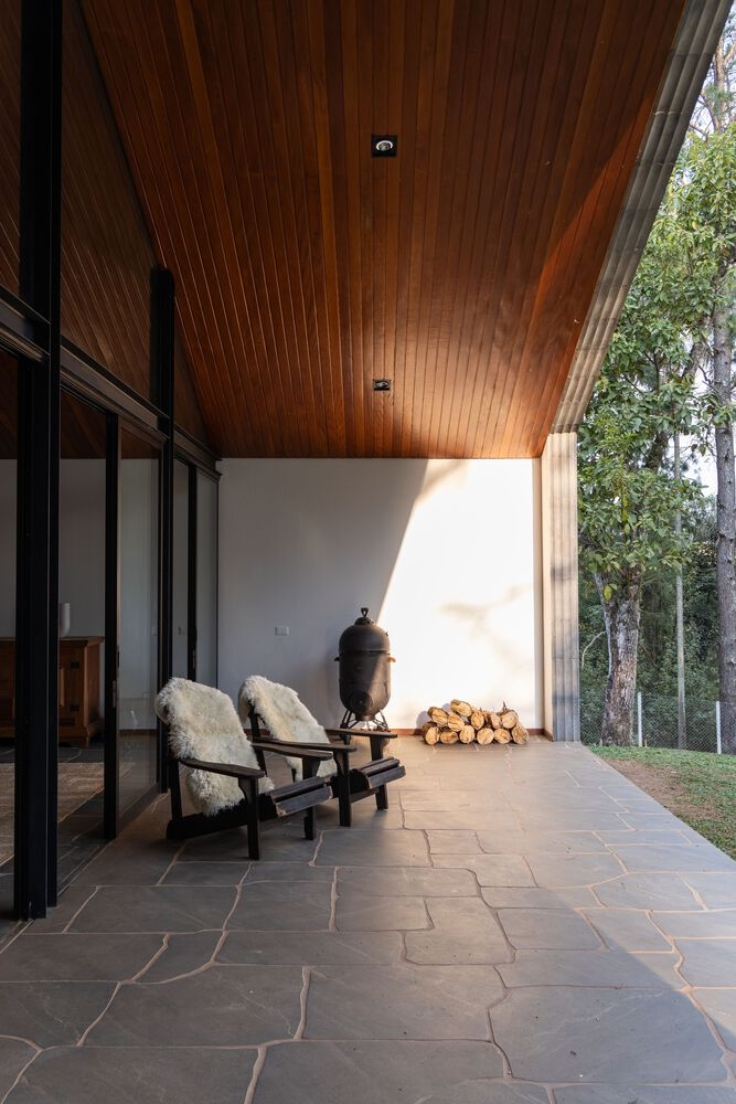 Given São Roque’s humid climate, the exterior cladding is designed to withstand moisture while maintaining a comfortable indoor environment. The house leverages passive solar heating, with controlled sunlight warming the bedrooms. A central fireplace anchors the social space, offering warmth and comfort during cooler seasons.