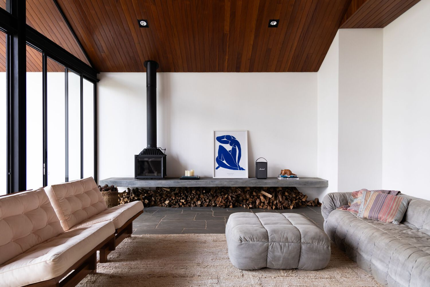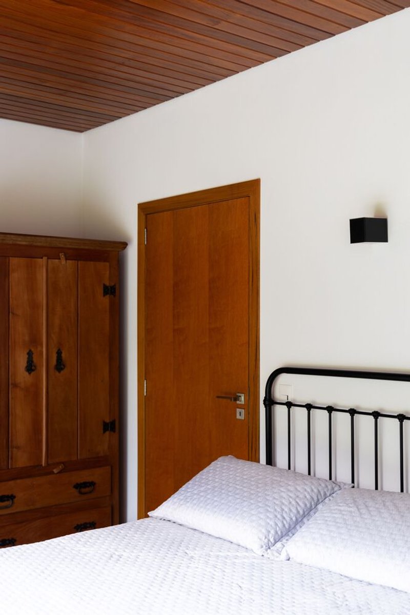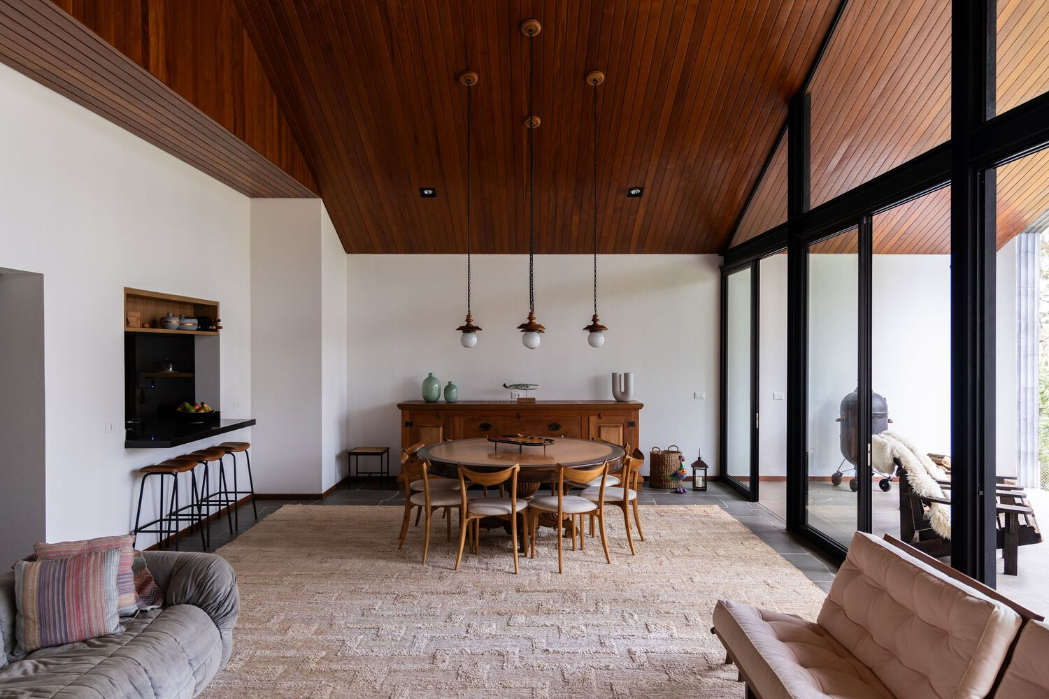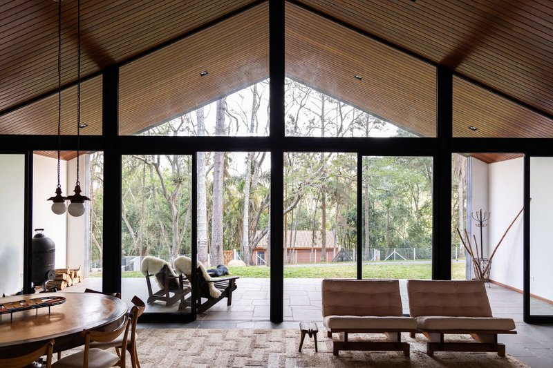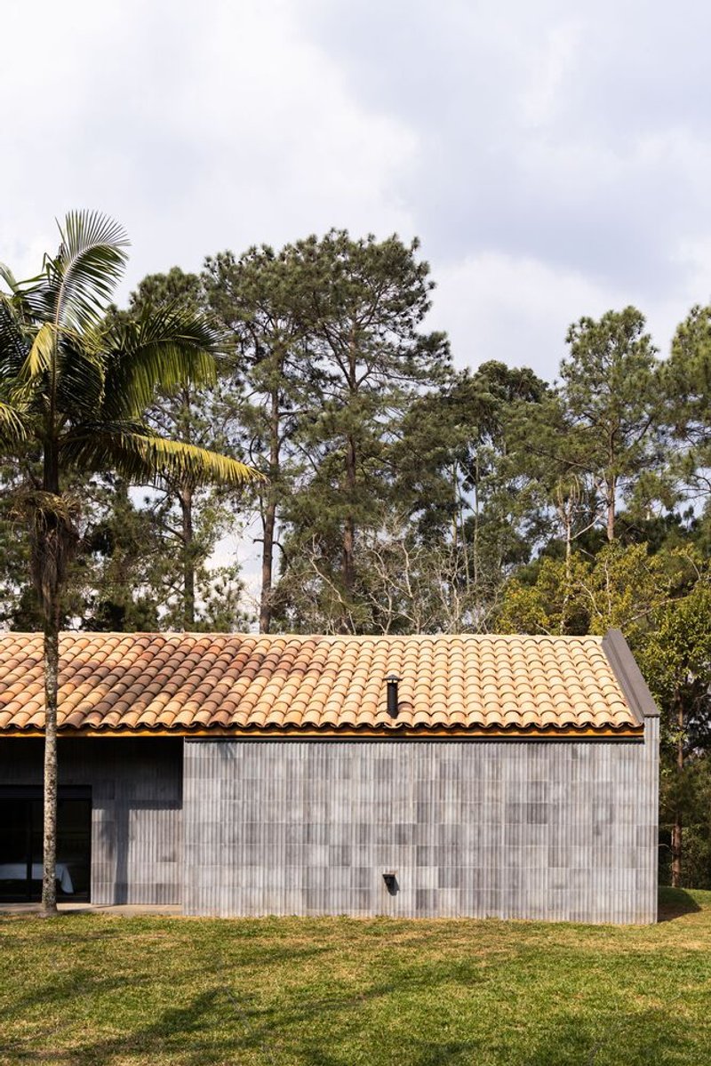 Given São Roque’s humid climate, the exterior cladding is designed to withstand moisture while maintaining a comfortable indoor environment. The house leverages passive solar heating, with controlled sunlight warming the bedrooms. A central fireplace anchors the social space, offering warmth and comfort during cooler seasons.
