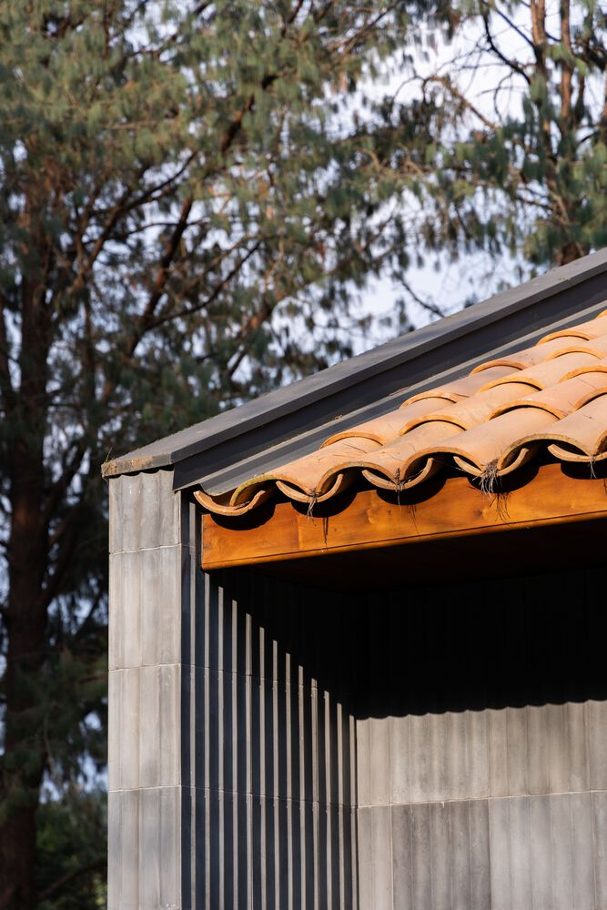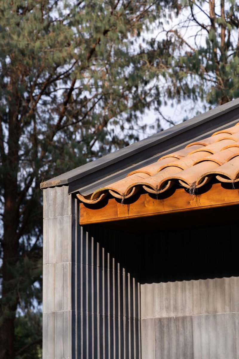 A gable roof with large clay tiles reinforces the home's rural aesthetic, while the contrasting façade materials create a dynamic architectural expression—one side is entirely transparent, maximizing views and natural light, while the opposite is a solid wall, ensuring privacy and insulation.