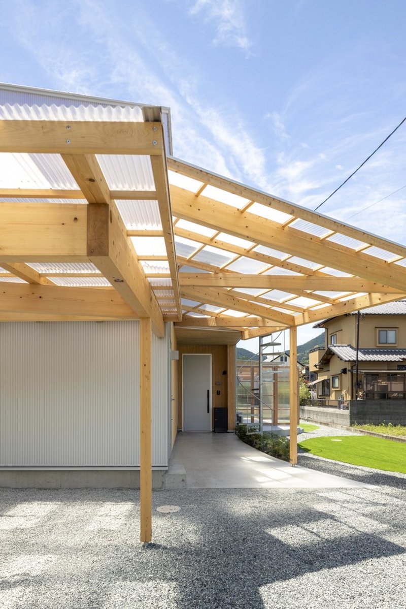 Natural light plays a central role in the spatial design of House M. The approach roof, made of varying transparencies of polycarbonate, allows dappled light to filter through nearby trees, creating a serene transition into the home. The carport, designed as an architectural extension of the house, offers shaded protection without compromising the overall aesthetic.