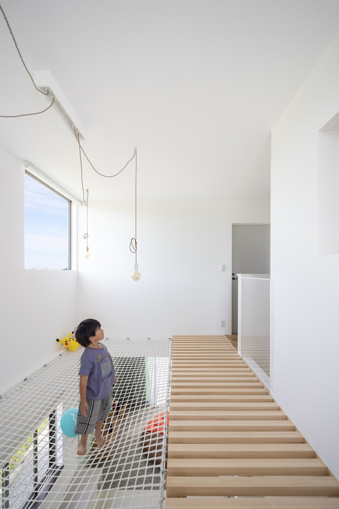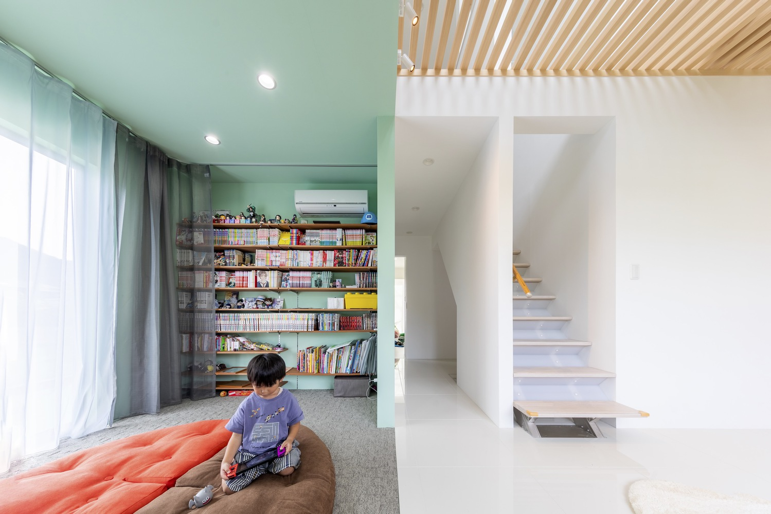 Inside, the living room expands vertically and spatially, allowing family members to engage in diverse activities while maintaining a harmonious sense of proximity. A variety of materials—ranging in texture, color, and form—enhance the sensory experience, celebrating everyday life through a careful orchestration of space.