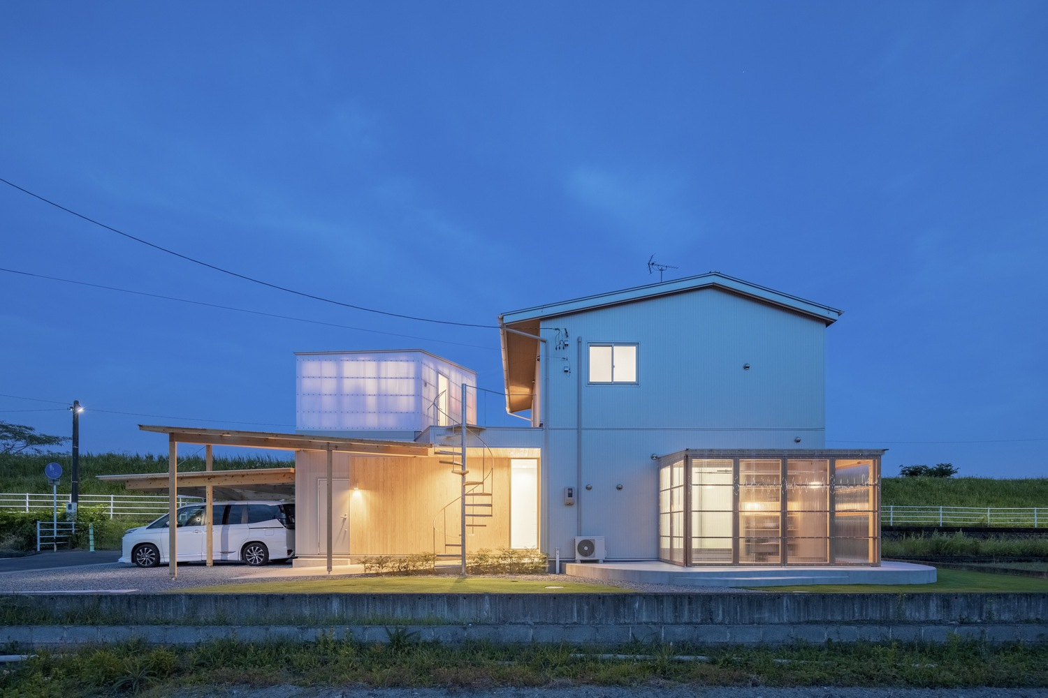 Transparent, polycarbonate-clad home in rural Shizuoka integrates light, landscape, and sustainable design through renovation and spatial layering.