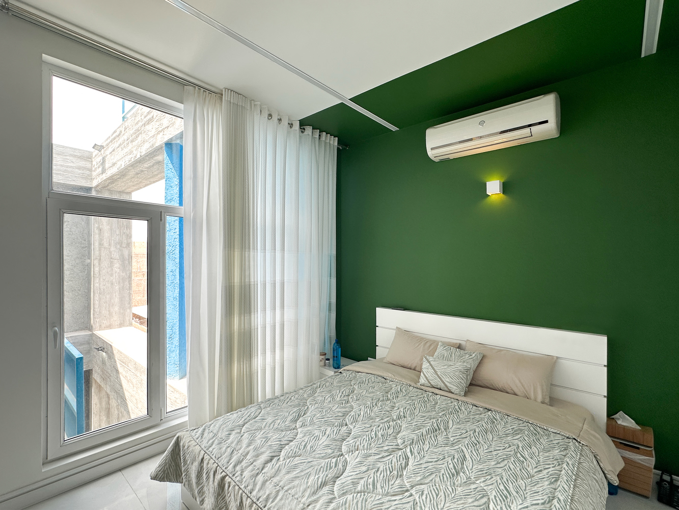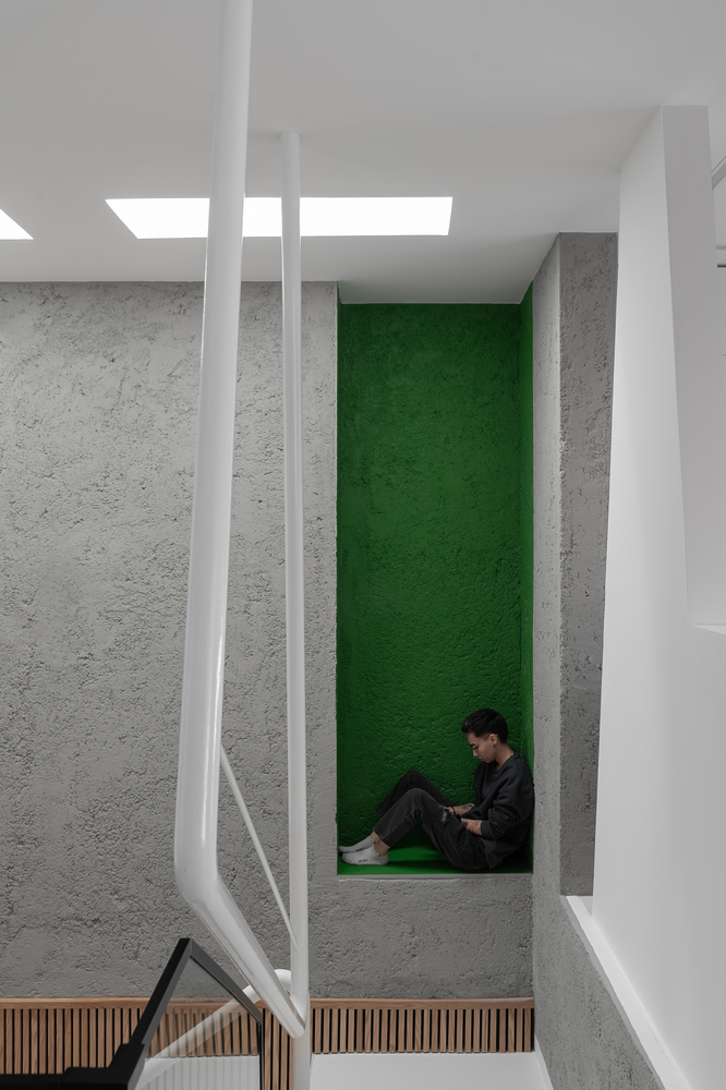 Economic considerations influenced material choices, leading to the use of simple, cost-effective materials such as cement. Its raw, unpolished application complements the home’s honest and functional aesthetic. Color is strategically employed to enhance the spatial journey: blue signifies seclusion, while green conveys tranquility, guiding inhabitants subtly through the home’s multiple layers of space.